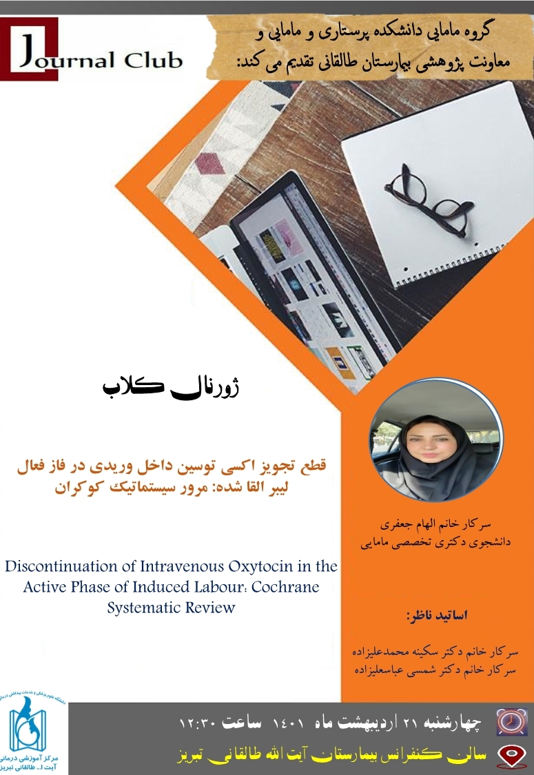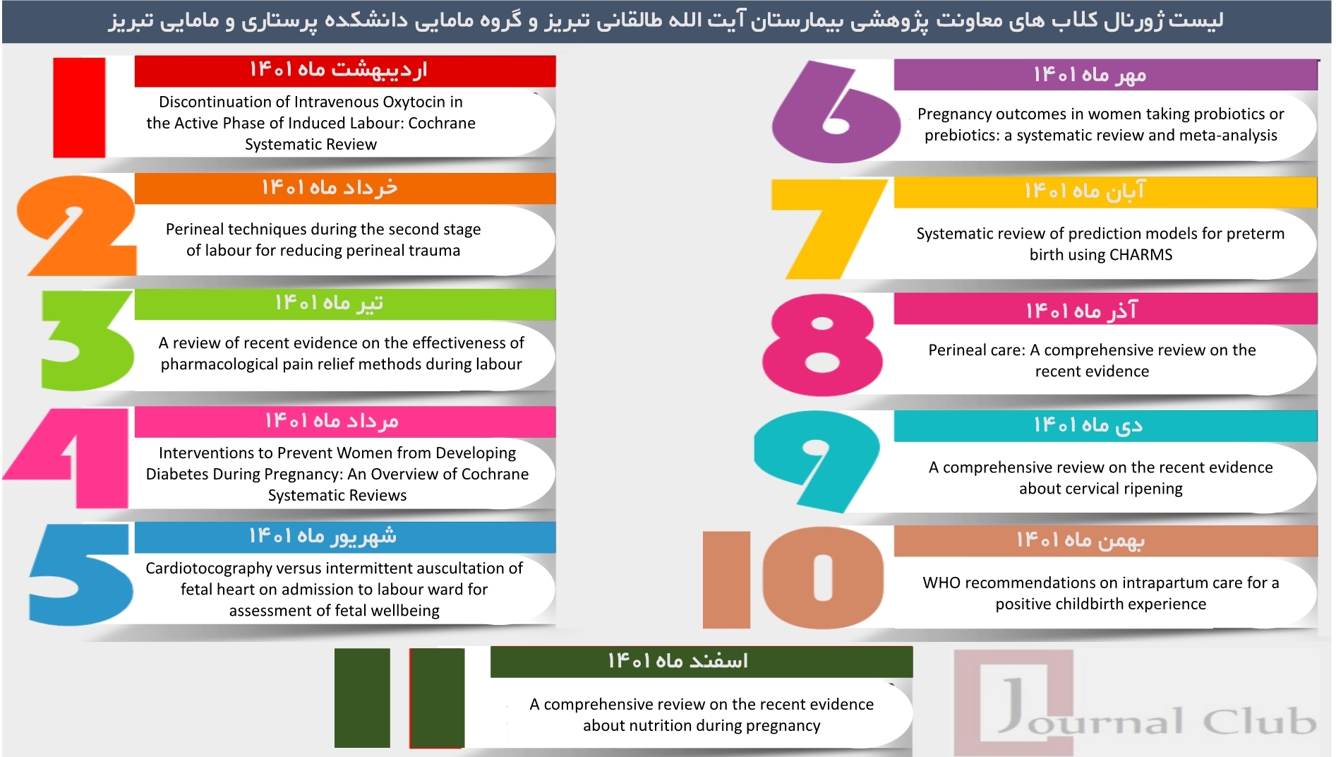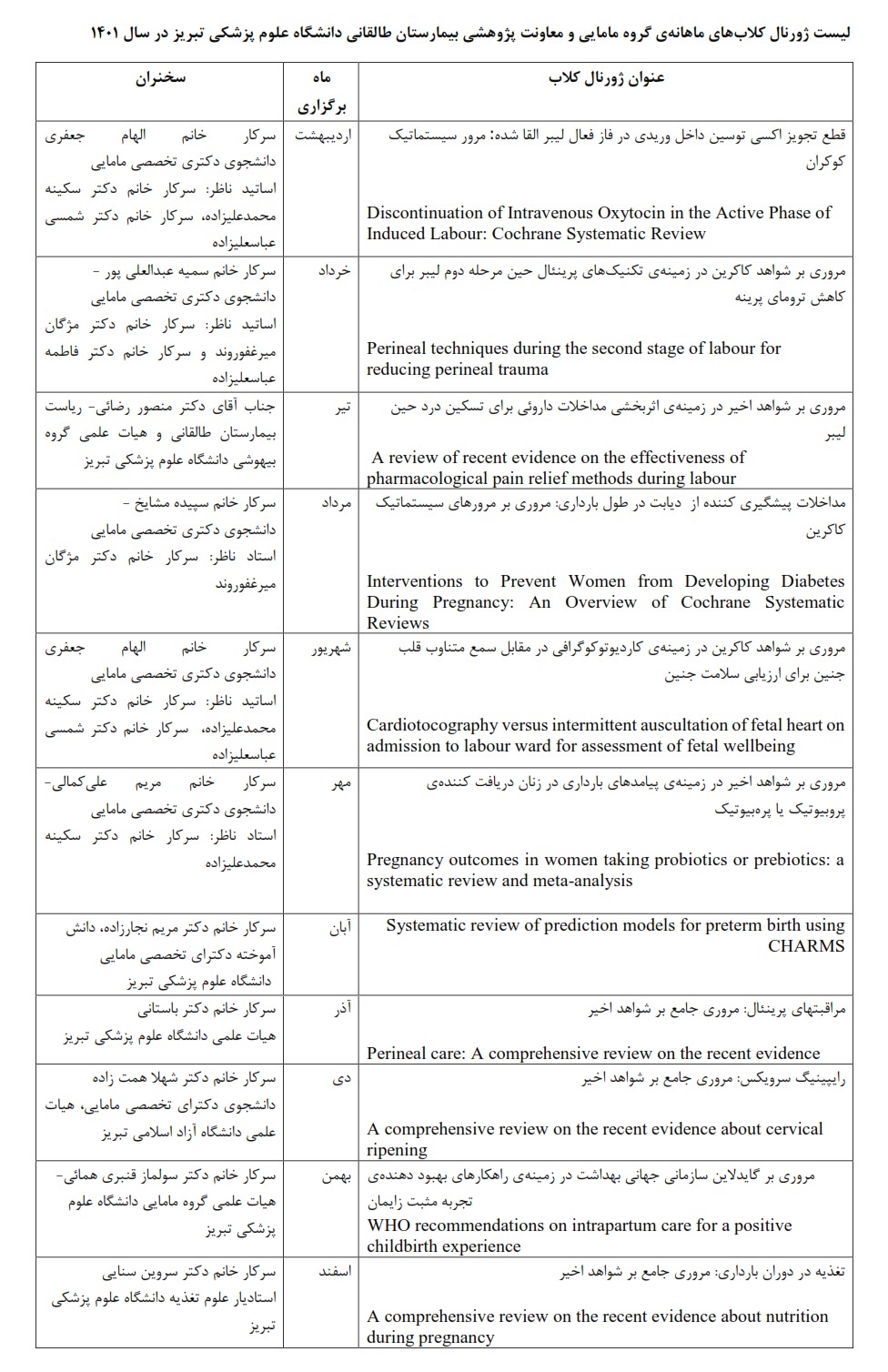 لیست ژورنال کلابهای ماهانه گروه مامایی و معاونت پژوهشی بیمارستان طالقانی دانشگاه علوم پزشکی تبریز در سال 1401