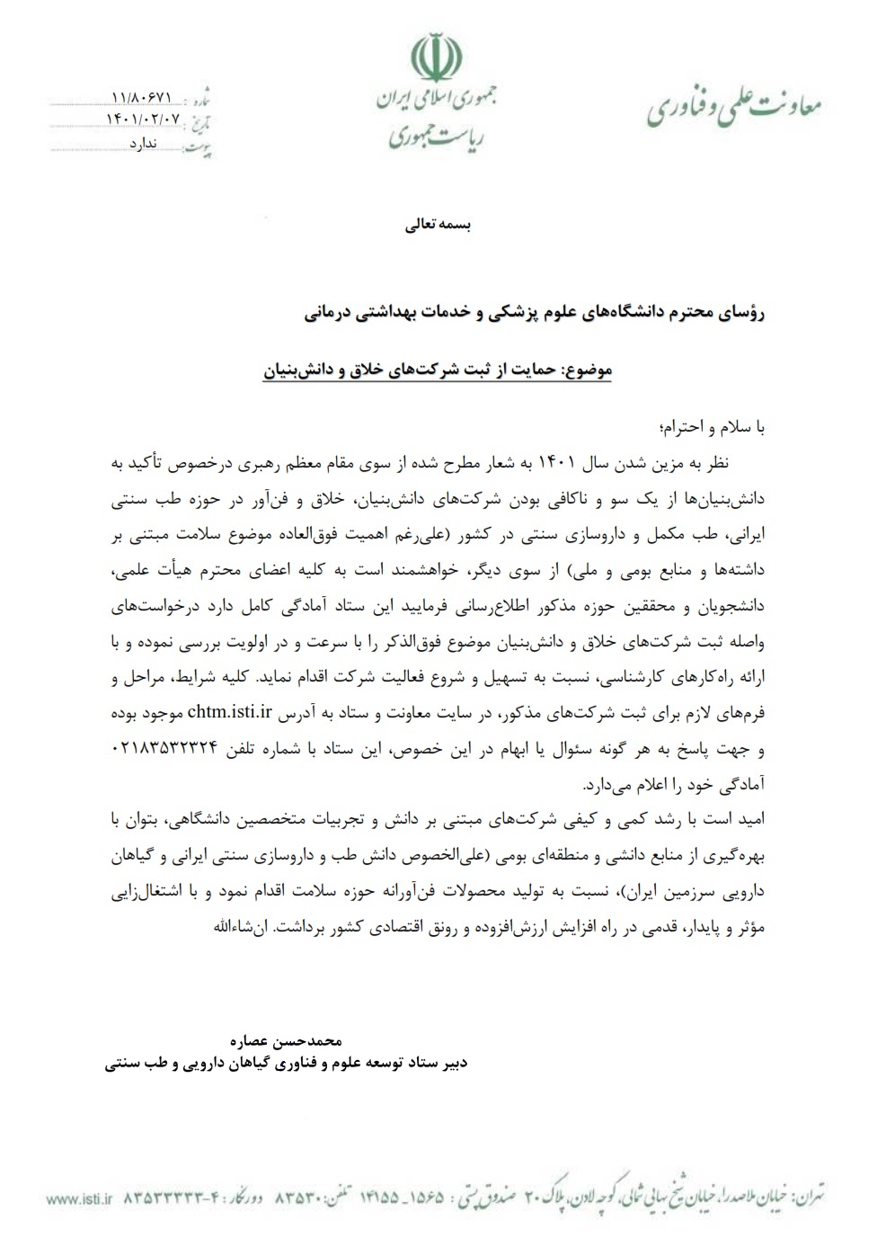 حمایت از ثبت شرکتهای خلاق و دانش بنیان در حوزه طب سنتی ایرانی؛ طب مکمل و داروسازی سنتی