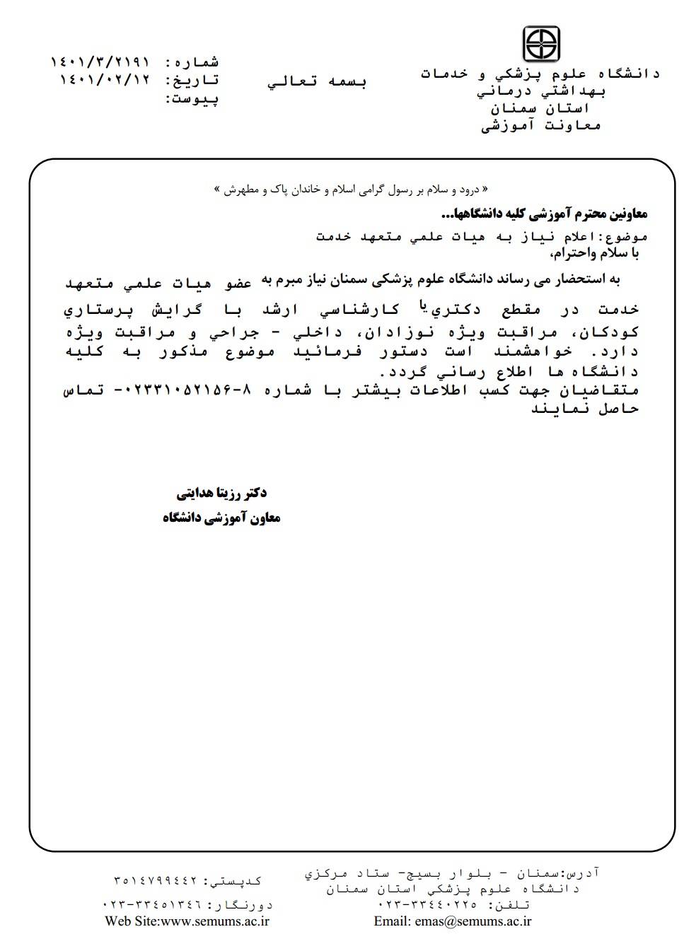 اعلام نیاز به هیات علمی متعهد خدمت دانشگاه علوم پزشکی سمنان