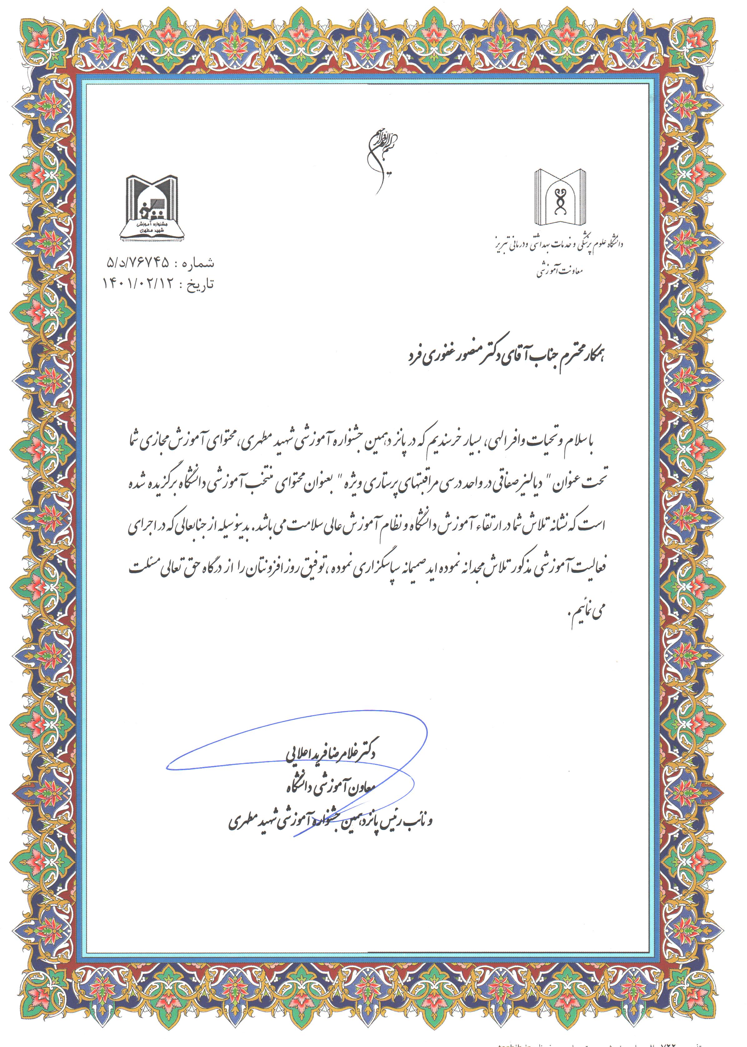 تبریکِ موفقیت جناب آقای دکتر منصور غفوری فرد در پانزدهمین جشنواره آموزشی شهید مطهری