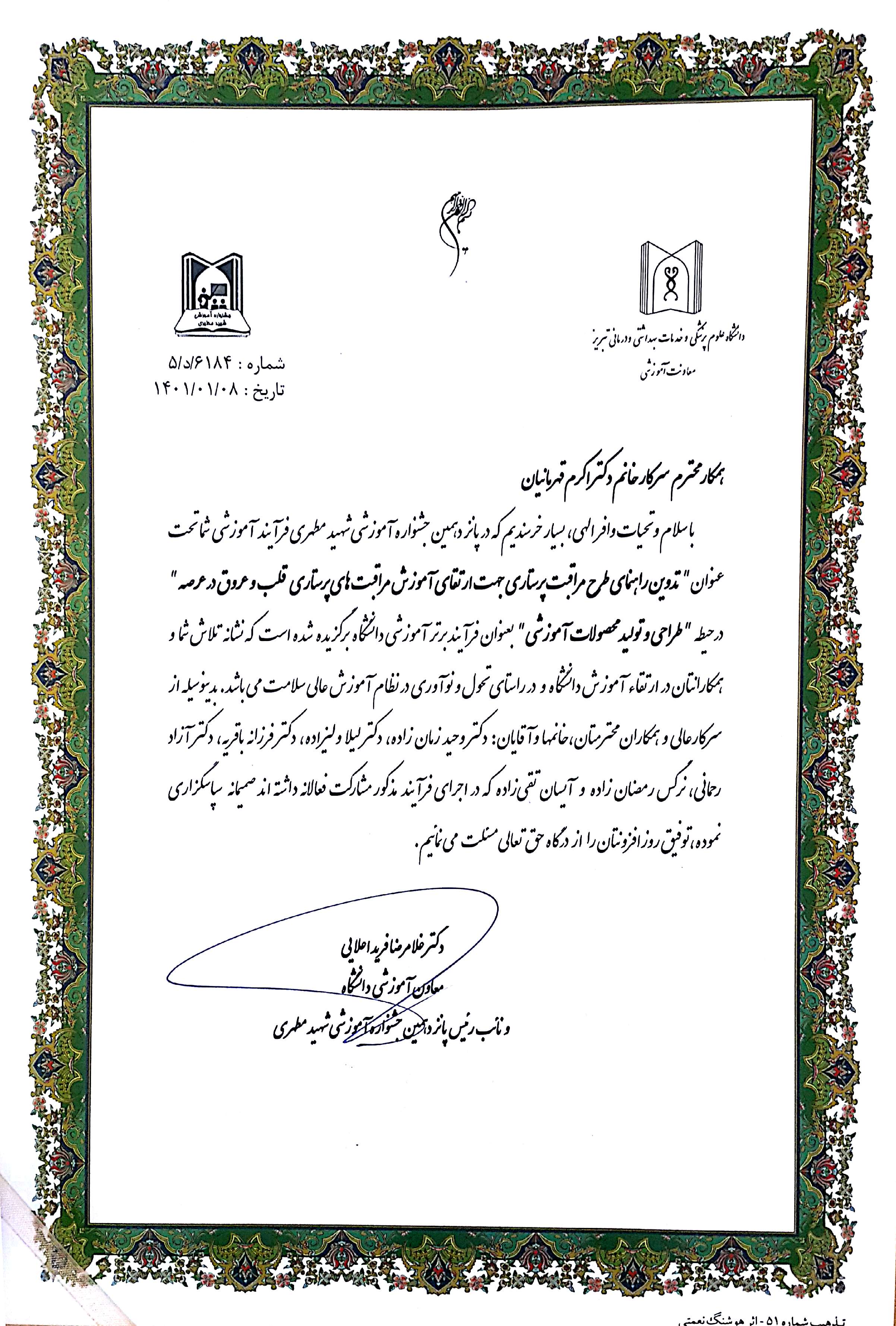تبریکِ موفقیت سرکار خانم دکتر اکرم قهرمانیان در پانزدهمین جشنواره آموزشی شهید مطهری