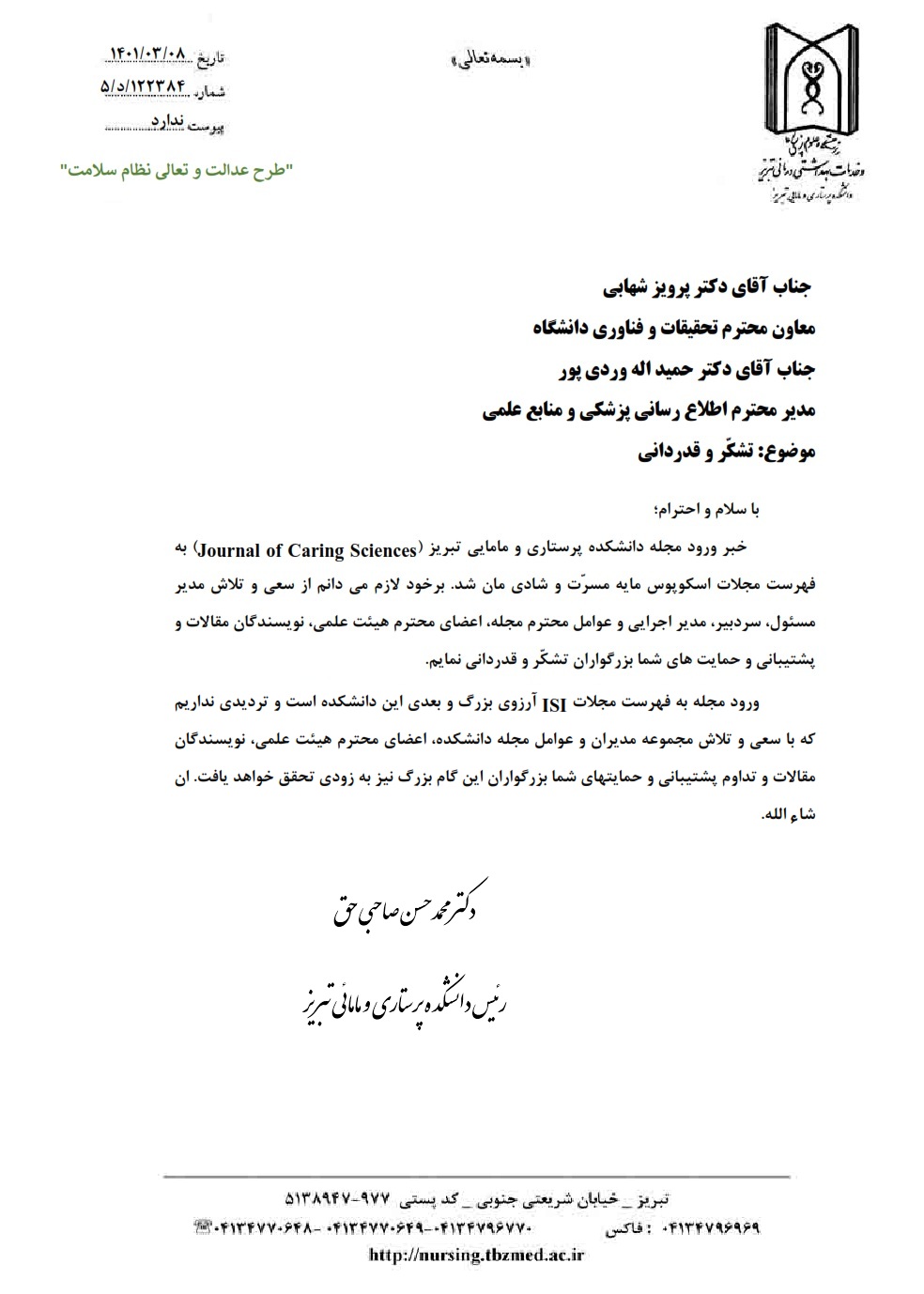 بر اساس اعلام رئیس محترم دانشکده، مجله دانشکده پرستاری و مامائی تبریز (Journal of Caring Sciences) در فهرست مجلات اسکوپوس ایندکس گردید. این موفقیت را به کلیه همکاران محترم دانشکده علی الخصوص مدیر مسئول، سردبیر، مدیر اجرائی و عوامل محترم مجله، اعضای محترم هیات علمی تبریک و تهنیت عرض می نمائیم.
