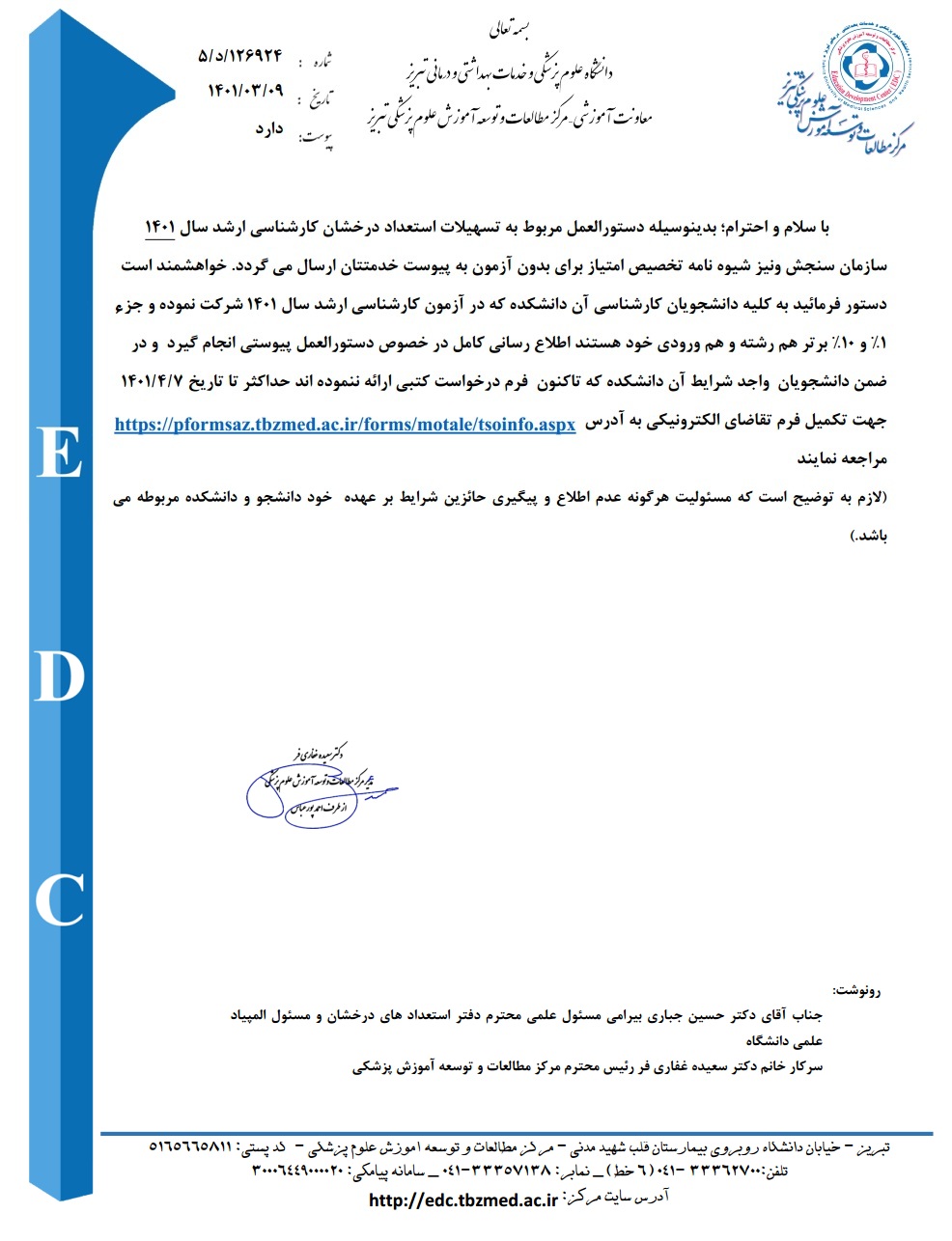 بر اساس اعلام مدیر مرکز مطالعات و توسعه آموزش علوم پزشکی، بدینوسیله دستورالعمل مربوط به تسهیلات استعداد درخشان کارشناسی ارشد سال 1401 سازمان سنجش و نیز شیوه نامه تخصیص امتیاز برای بدون آزمون اعلام گردید.