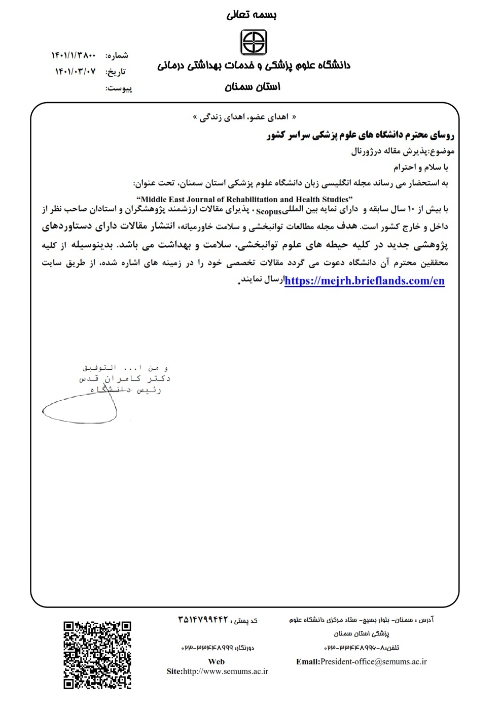 اطلاعیه پذیرش مقاله در مجله دانشگاه علوم پزشکی سمنان