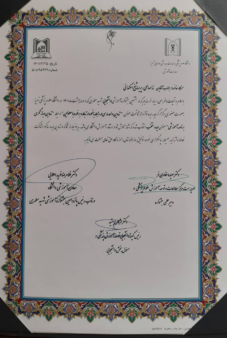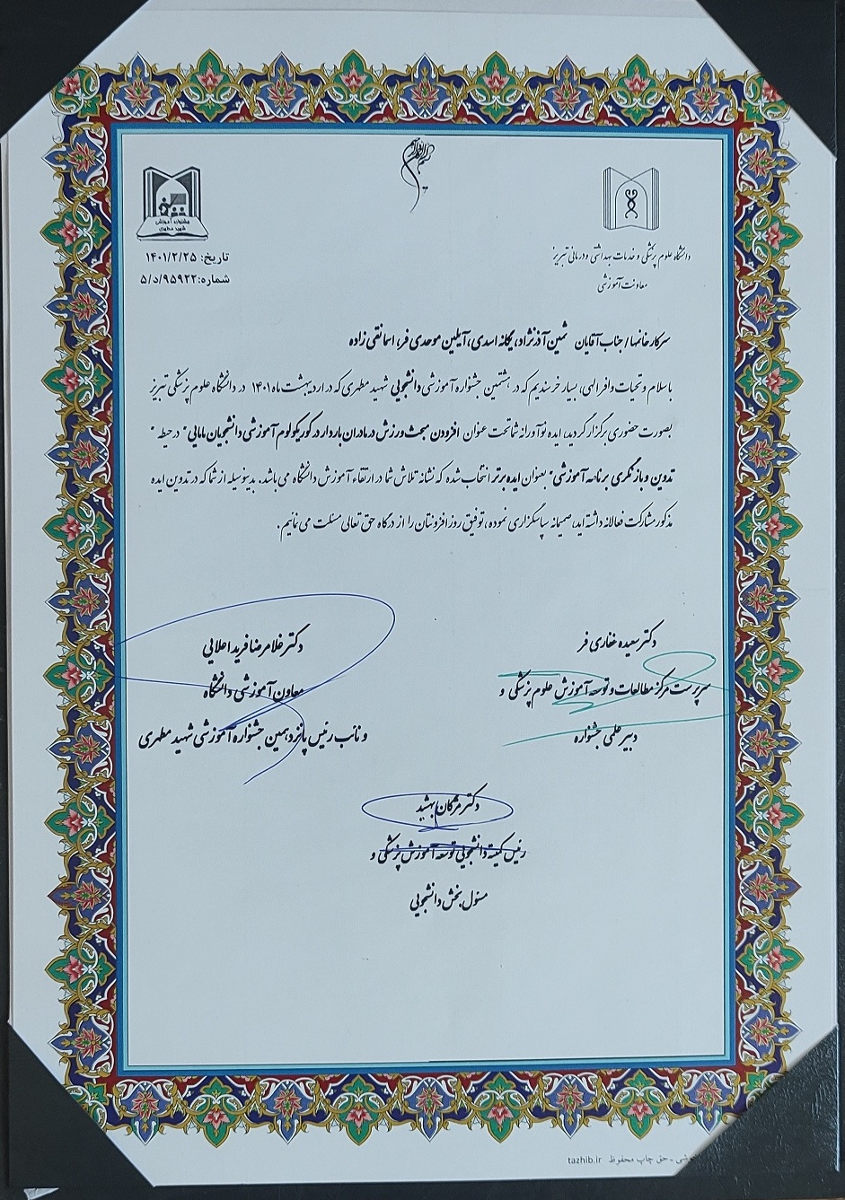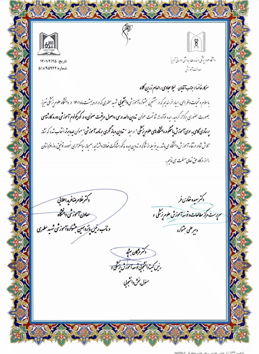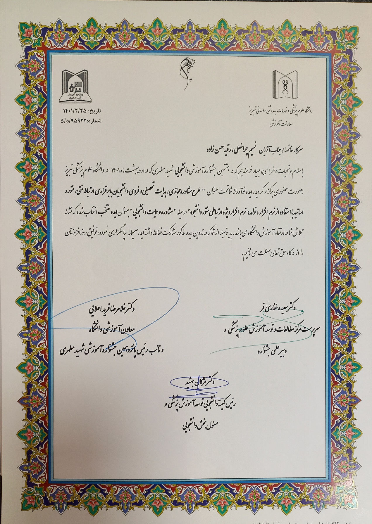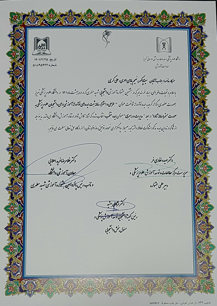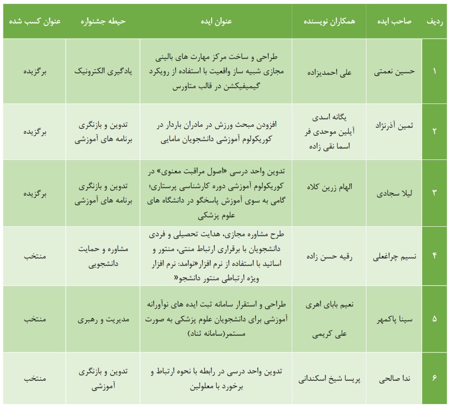 بر اساس اعلام سرکار خانم دکتر مژگان بهشید؛ رئیس کمیته توسعه آموزش پزشکی و مسئول بخش دانشجویی هشتمین جشنواره آموزشی دانشجویی شهید مطهری، 6 ایده نوآورانه دانشجویان دانشکده پرستاری و مامائی تبریز در این جشنواره بعنوان ایده منتخب معرفی گردیده اند. این موفقیت را خدمت تمامی دانشجویان، علی الخصوص این دانشجویان گرامی، اساتید محترم و کارکنان گرامی دانشکده تبریک و تهنیت عرض نموده، توفیق روزافزونشان را از درگاه خداوند منان خواستاریم.