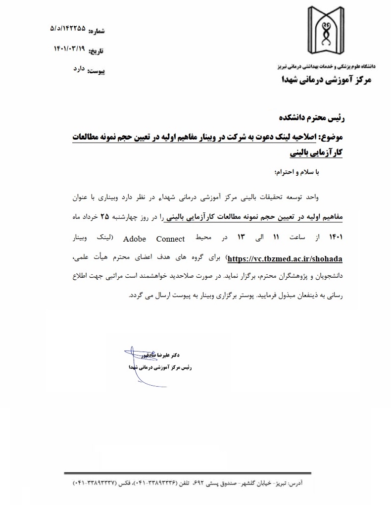اصلاحیه لینک دعوت به شرکت در وبینار «مفاهیم اولیه در تعیین حجم نمونه مطالعات کارآزمایی بالینی»