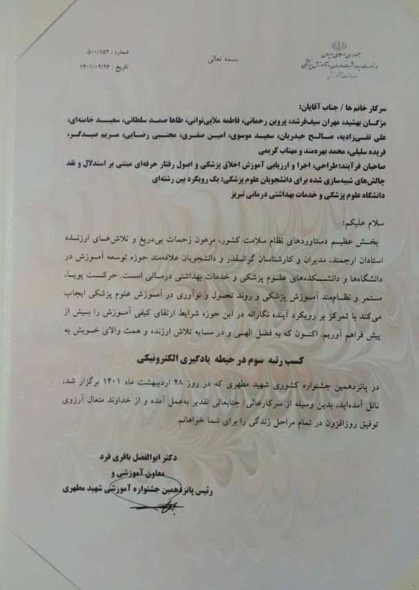 کسب رتبه سوم پانزدهمین جشنواره کشوری شهید مطهری و عنوان استادیار تلاشگر دانشگاه