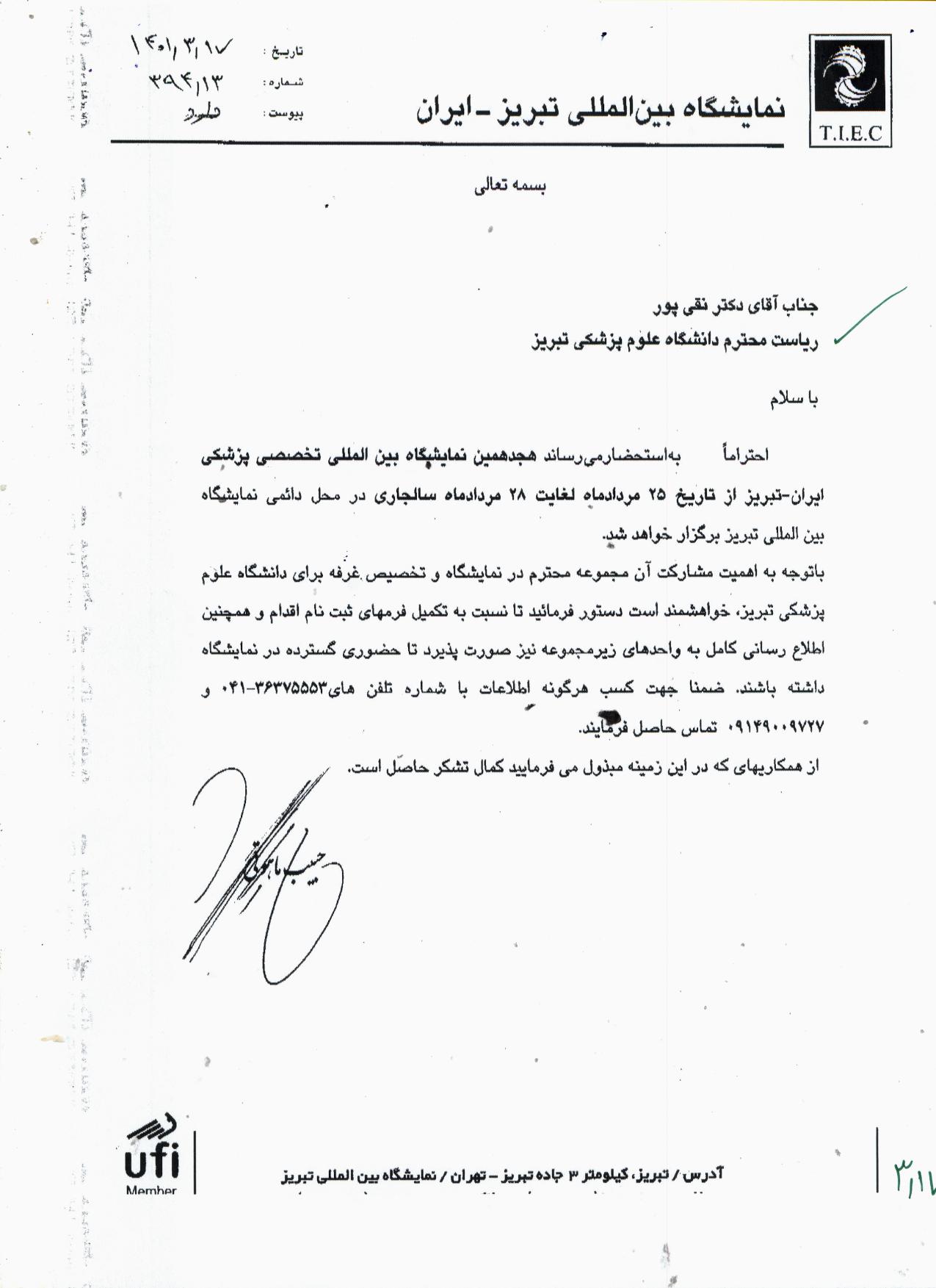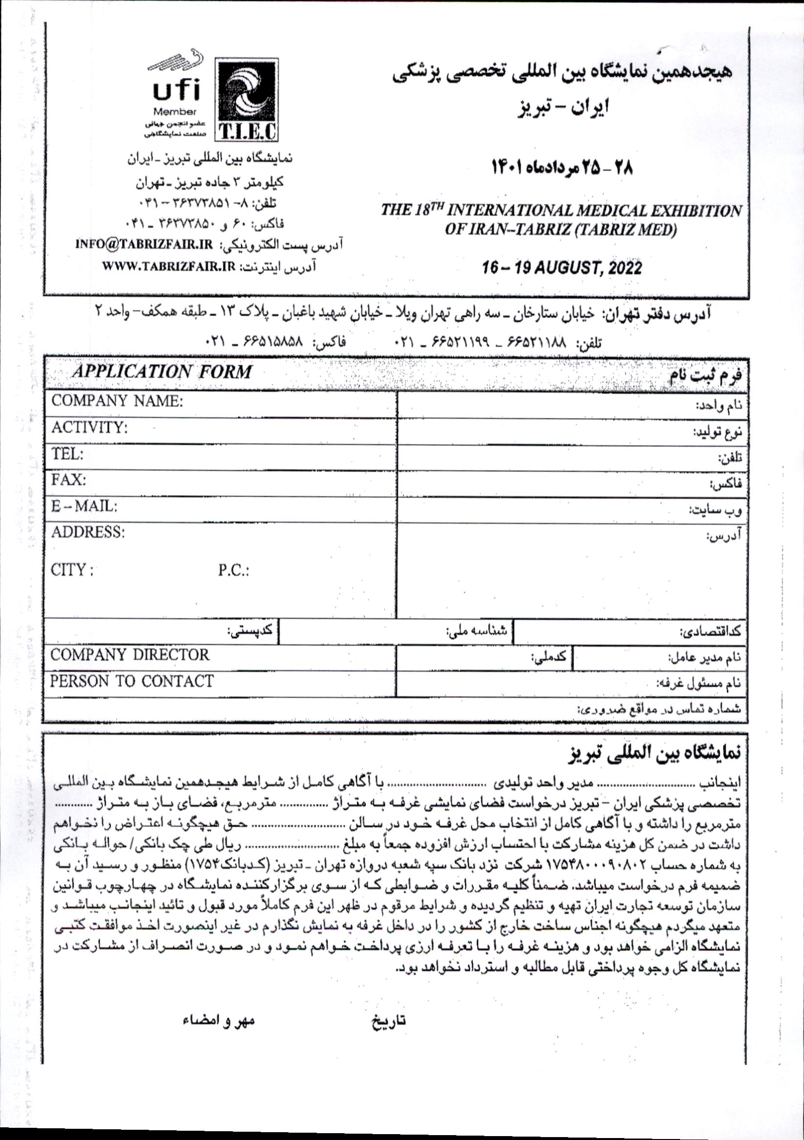 به اطلاه می رساند هجدهمین نمایشگاه بین المللی تخصصی پزشکی ایران-تبریز از تاریخ 25 مرداد لغایت 28 مرداد سال جاری در محل دائمی نمایشگاه بین المللی تبریز برگزار خواهد شد. با توجه به اهمیت مشارکت مجموعه دانشگاه علوم پزشکی تبریز در نمایشگاه و تخصیص غرفه از علاقمندان دعوت میگردد تا نسبت به تکمیل فرمهای ثبت نام اقدام نمایند.