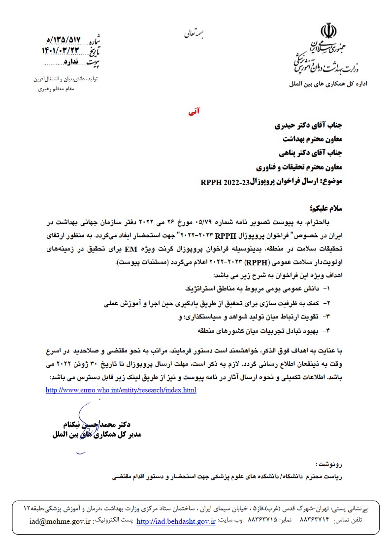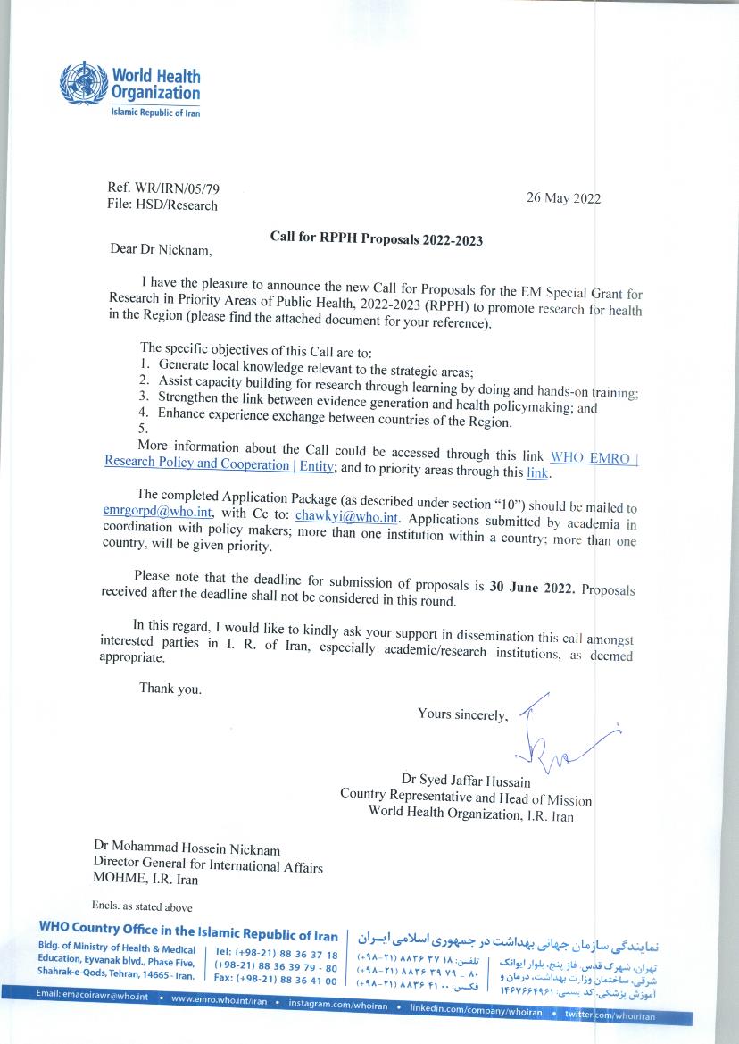 فراخوان پروپوزال RPPH 2022-23 (پروپوزال گرنت ویژه EM) دفتر سازمان جهانی بهداشت ایران