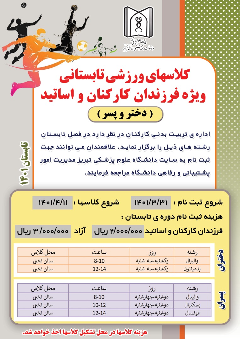 اطلاعیه کلاسهای ورزشی تابستانی دانشگاه ویژه فرزندان کارکنان و اساتید (دختر و پسر)