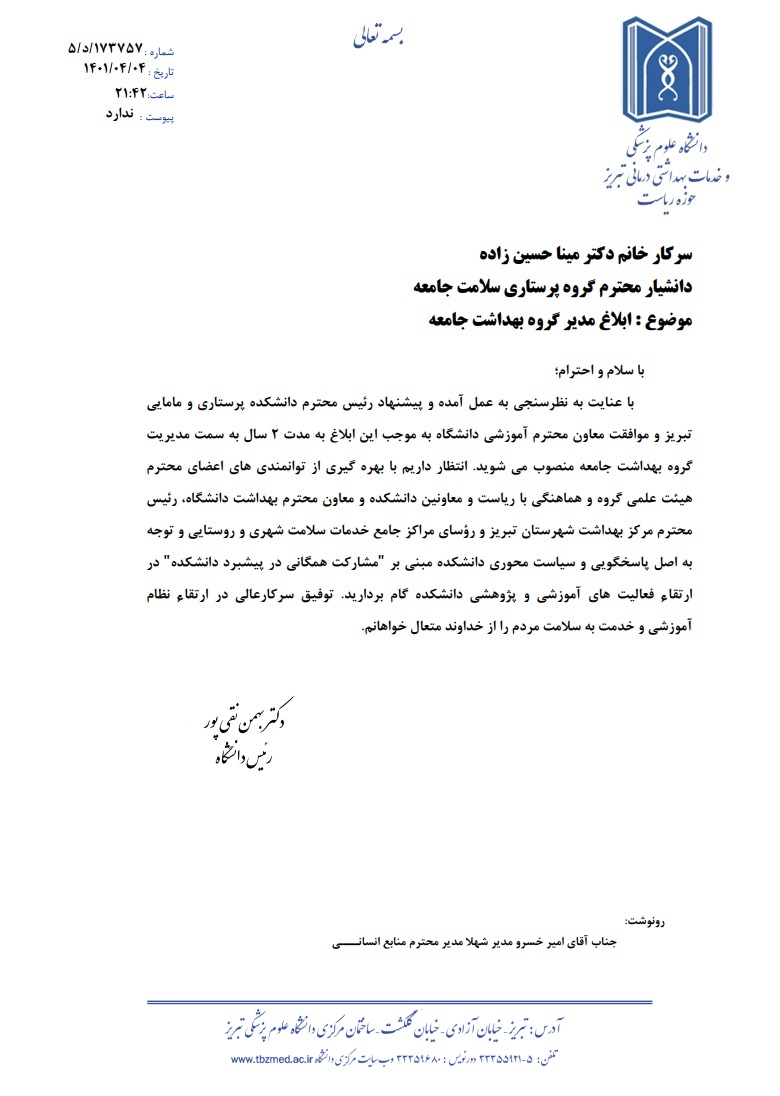 بر اساس ابلاغ صادره از سوی ریاست محترم دانشگاه، سرکار خانم دکتر مینا حسین زاده (دانشیار گروه پرستاری بهداشت جامعه)، بمدت 2 سال به سمت مدیریت این گروه منصوب گردید. در متن این ابلاغ آمده است: با عنایت به نظرسنجی بعمل آمده و پیشنهاد رئیس محترم دانشکده پرستاری و مامائی تبریز و موافقت معاون محترم آموزشی دانشگاه ...