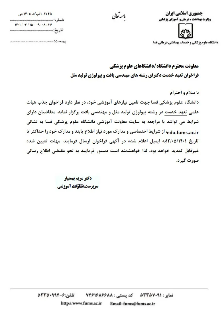 فراخوان تعهد خدمت دکترای رشته های مهندسی بافت و بیولوژی تولید مثل دانشگاه علوم پزشکی فسا