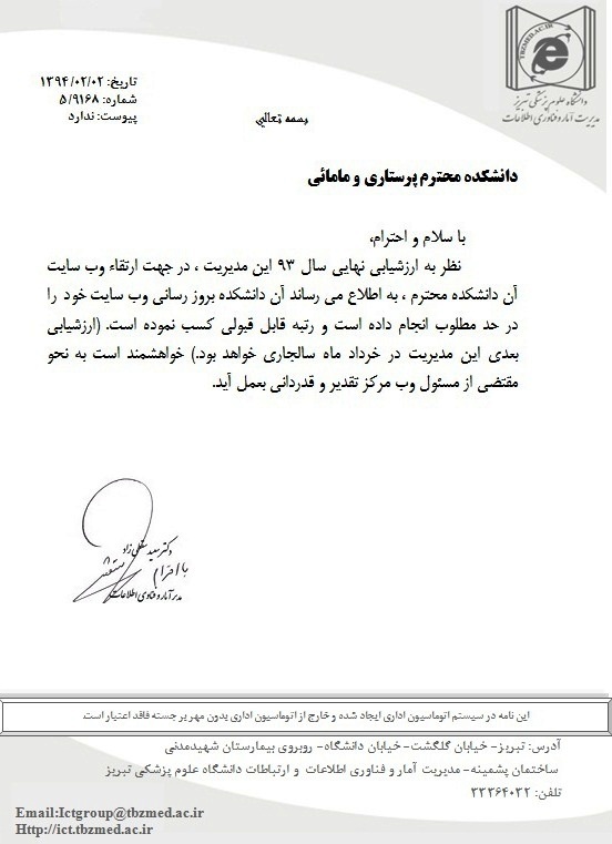 تقدیر مدیر محترم آمار و فناوری اطلاعات دانشگاه علوم پزشکی تبریز از وبسایت دانشکده