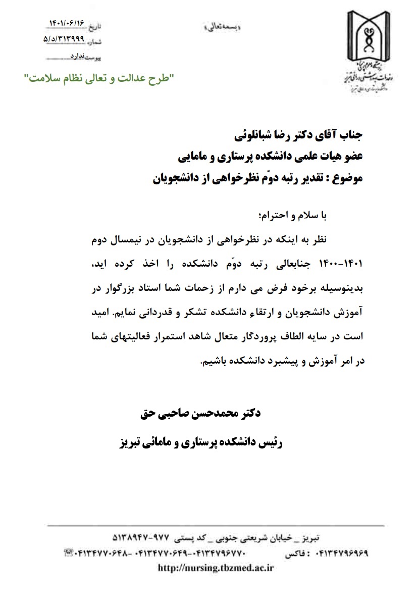 به استحضار میرساند جناب آقای دکتر رضا شبانلوئی (عضو هیات علمی گروه پرستاری داخلی جراحی دانشکده) رتبه دوم نظرخواهی از دانشجویان دانشکده در نیمسال دوم سال تحصیلی 1401-1400 را کسب نمودند. به همین مناسبت با ارسال نامه ای از سوی ریاست دانشکده از زحمات ایشان تقدیر و تشکر گردید. ما نیز بنوبه خود این موفقیت را خدمت ایشان تبریک عرض نموده، توفیق روزافزونشان را از درگاه خداوند منان خواستاریم.
