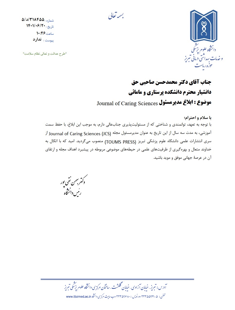 بر اساس ابلاغ صادره از سوی ریاست دانشگاه، جناب آقای دکتر محمدحسن صاحبی حق با حفظ سمت آموزشی بمدت 3 سال بعنوان مدیر مسئول جدید مجله دانشکده JCS (Journal of Caring Sciences) منصوب گردید. ضمن تبریک، برای ایشان از درگاه خداوند منان آرزوی توفیق و سلامتی روزافزون داریم.