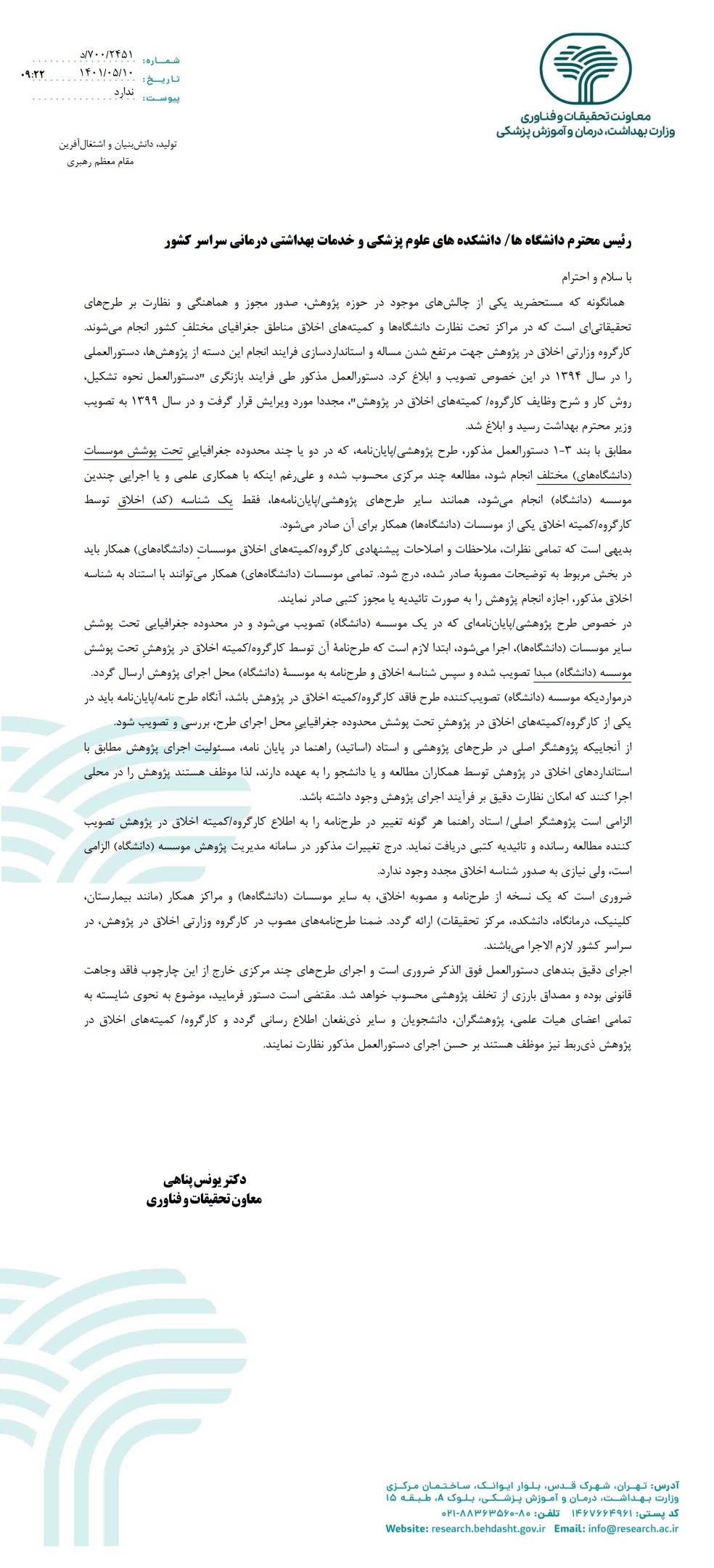اعلام دستورالعمل فرآیند اجرای طرح های چند مرکزی از سوی معاون تحقیقات و فناوری وزارت بهداشت