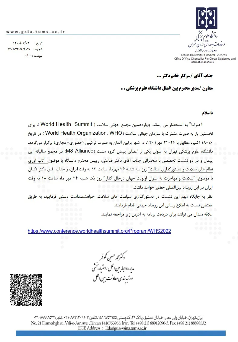 اطلاع رسانی برگزاری چهاردهمین نشست مجمع جهانی سلامت (World Health Summit)