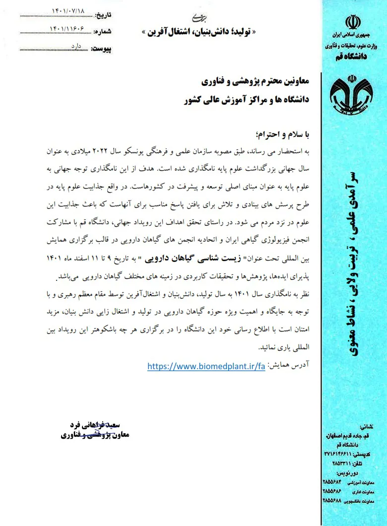 به اطلاع علاقمندان میرساند همایش بین المللی تحت عنوان «زیست شناسی گیاهان دارویی» به تاریخ 9 تا 11 اسفند 1401 به همت معاونت تحقیقات و فناوری دانشگاه علوم پزشکی قم و با همکاری انجمن فیزیولوژی گیاهی ایران و اتحادیه انجمن های گیاهان دارویی برگزار خواهد گردید.
