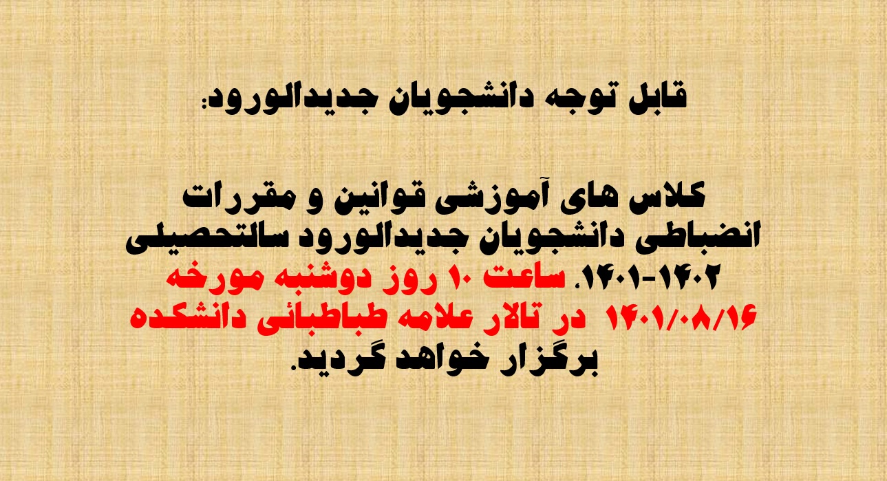 بنا بر اعلام معاون آموزشی و تحصیلات تکمیلی دانشکده، کلاس های آموزشی قوانین و مقررات انضباطی دانشجویان جدیدالورود سالتحصیلی 1402-1401، ساعت 10 روز دوشنبه مورخه 16 آبان 1401 در تالار علامه طباطبائی دانشکده برگزار خواهد گردید.