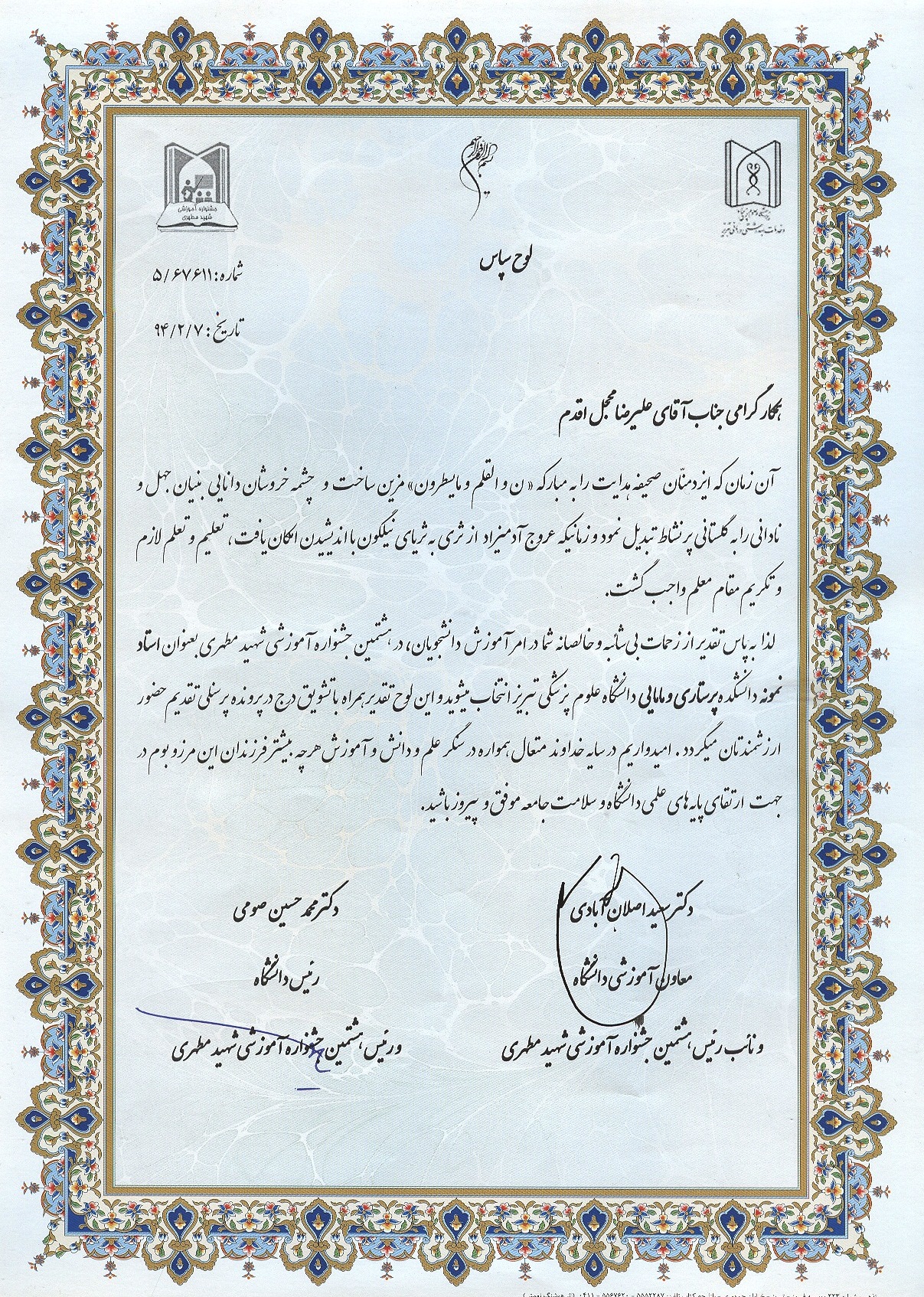 بدینوسیله انتخاب جناب آقای علیرضا محجل اقدم بعنوان "استاد نمونه" دانشکده پرستاری و مامایی تبریز در هشتمین جشنواره شهید مطهری ...