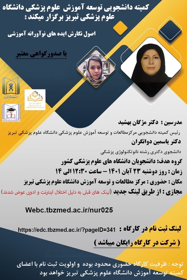 به اطلاع علاقمندان میرساند کمیته دانشجویی توسعه آموزش پزشکی دانشگاه با همکاری شبکه دانشجویی توسعه آموزش پزشکی وزارت و واحد RDCC دانشگاه بمنظور آشنایی دانشجویان علوم پزشکی با جشنواره ایده های نوآورانه آموزشی و توانمندسازی آنها برای ایده پروری و ارسال آثار، کارگاه آموزشی «اصول نگارش ایده های نوآورانه آموزشی» را برگزار می نماید. لازم به ذکر است که لینک معرفی شده در پوستر کارگاه به نشانی http://webc.tbzmed.ac.ir/nur025 تغییر یافته است.