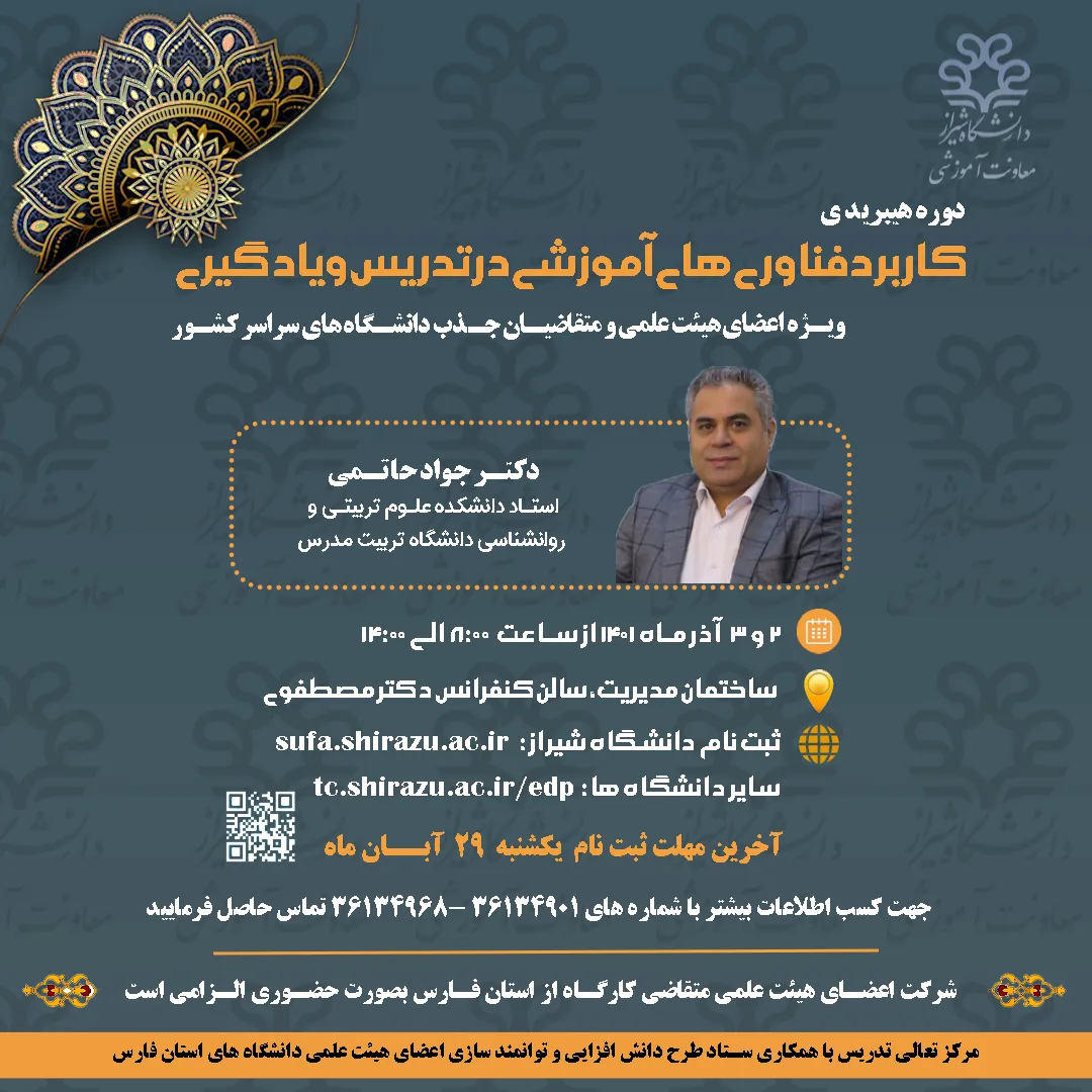 به اطلاع علاقمندان میرساند دوره هیبریدی کاربرد فناوریهای آموزشی در تدریس و یادگیری، به همت معاونت آموزشی دانشگاه شیراز و با ارائه آقای دکتر جواد حاتمی، روزهای 2 و 3 آذرماه 1401 از ساعت 8 الی 14 برگزار خواهد گردید.