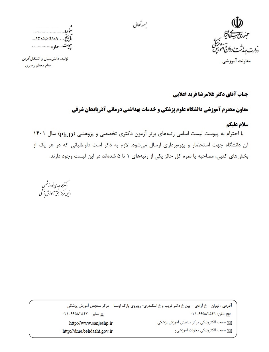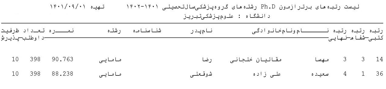 اعلام اسامی رتبه های برتر آزمون Ph.D رشته های گروه پزشکی سالتحصیلی 1402-1401 دانشگاه علوم پزشکی تبریز
