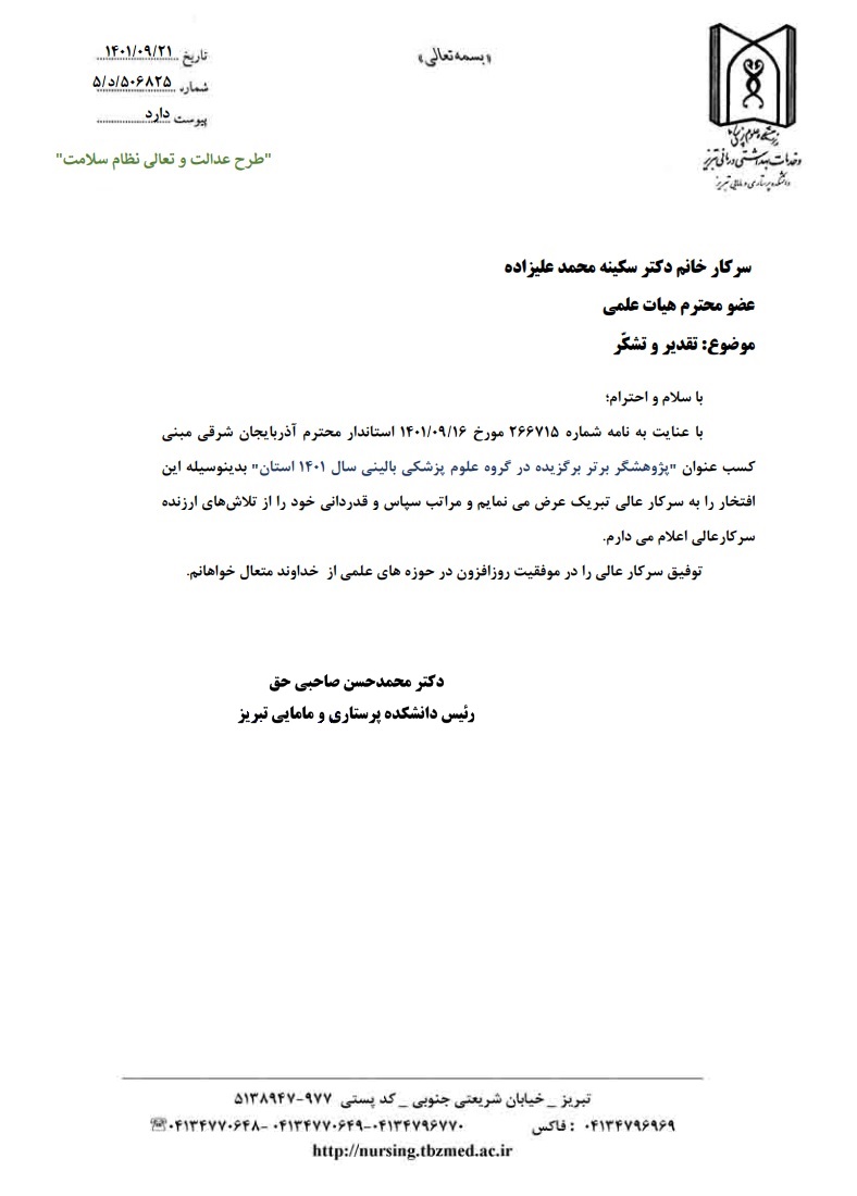 تقدیر و تشکر رئیس دانشکده از سرکار خانم دکتر سکینه محمدعلیزاده