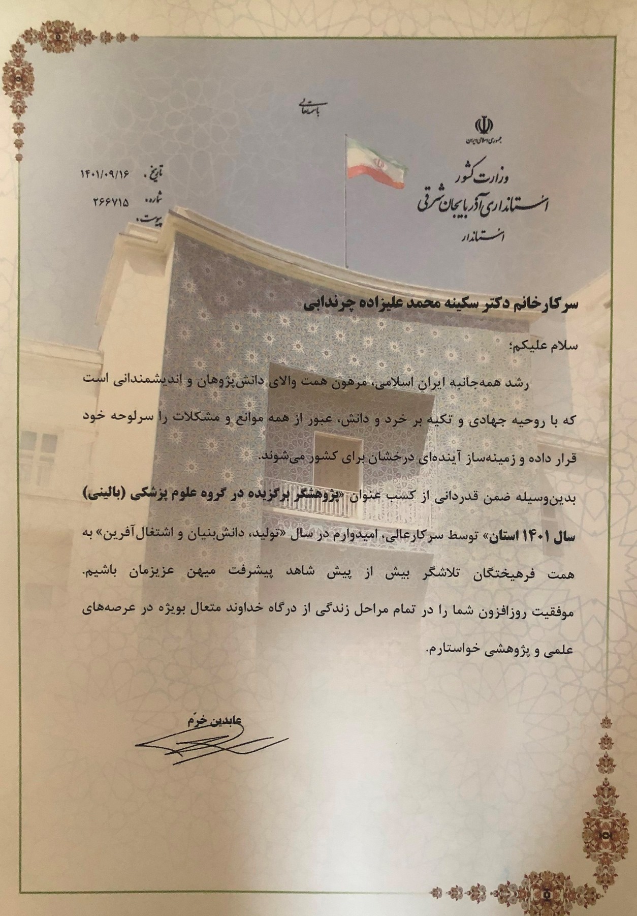 به گزارش روابط عمومی دانشکده، در پی انتخاب سرکار خانم دکتر سکینه محمدعلیزاده (عضو هیات علمی و استاد گروه مامایی دانشکده) بعنوان پژوهشگر برتر برگزیده در گروه علوم پزشکی بالینی 1401 استان از سوی استاندار، رئیس دانشکده نیز با انتشار پیامی این انتخاب را به ایشان تبریک گفتند.