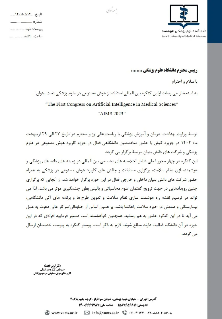 به اطلاعه علاقمندان میرساند اولین کنگره بین المللی هوش مصنوعی در علوم پزشکی، توسط وزارت بهداشت در تاریخ 27 الی 29 اردیبهشت ماه 1402 در جزیره کیش برگزار خواهد گردید.
