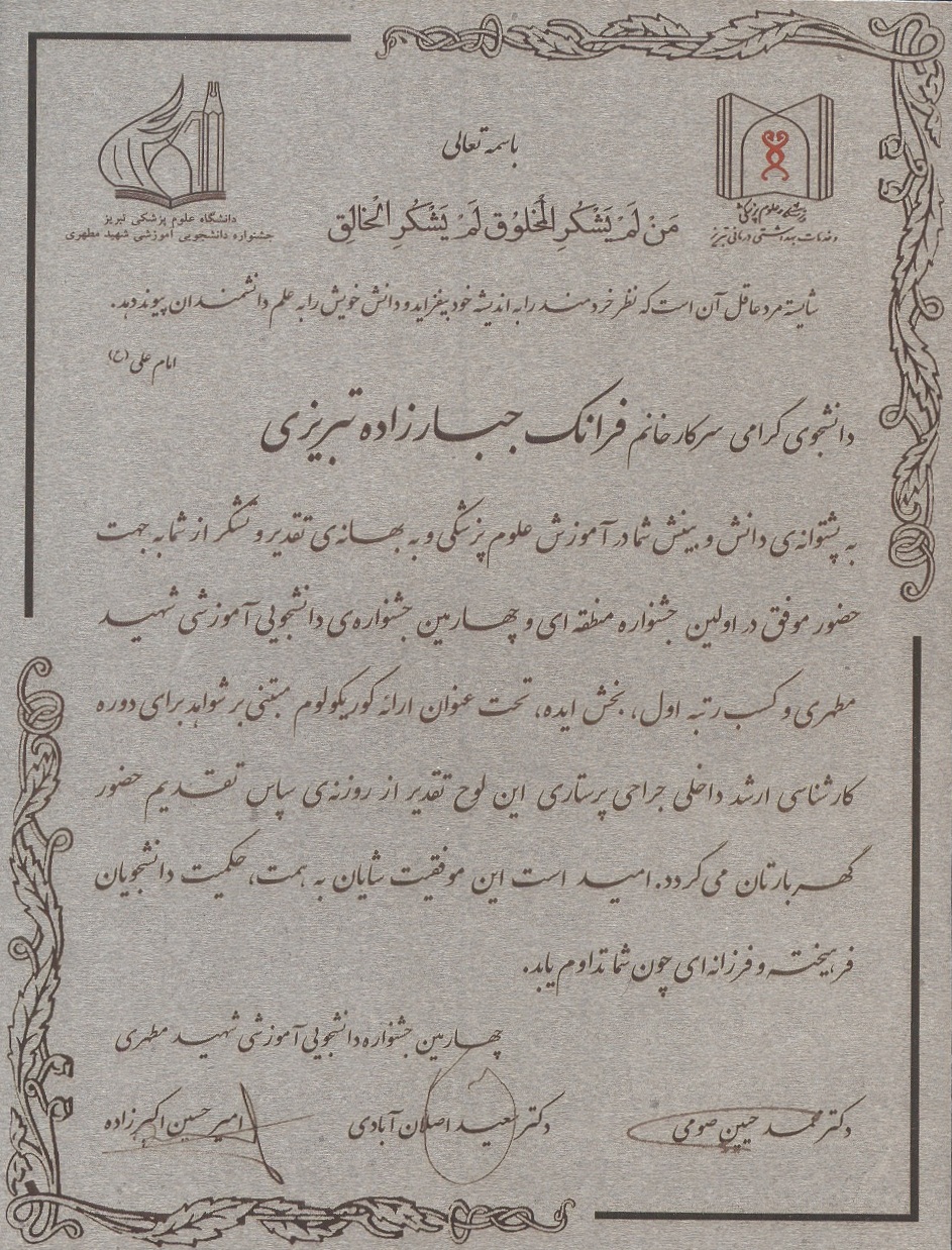 بدینوسیله دریافت لوح تقدیر و کسب رتبه اول بخش ایده چهارمین جشنواره دانشجویی آموزشی شهید مطهری توسط سرکار خانم فرانک جبارزاده ...