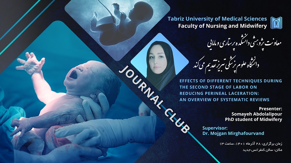 بنا بر اعلام مدیر گروه مامایی دانشکده، ژورنال کلاب خانم سمیه عبدالعلی پور، تحت عنوان «Effects of different techniques during the second stages of labor on reducing perineal laceration An overview of systematic Reviews» روز دوشنبه مورخ 28 آذر 1401 در سالن کنفرانس جدید دانشکده به صورت حضوری تشکیل خواهد شد.