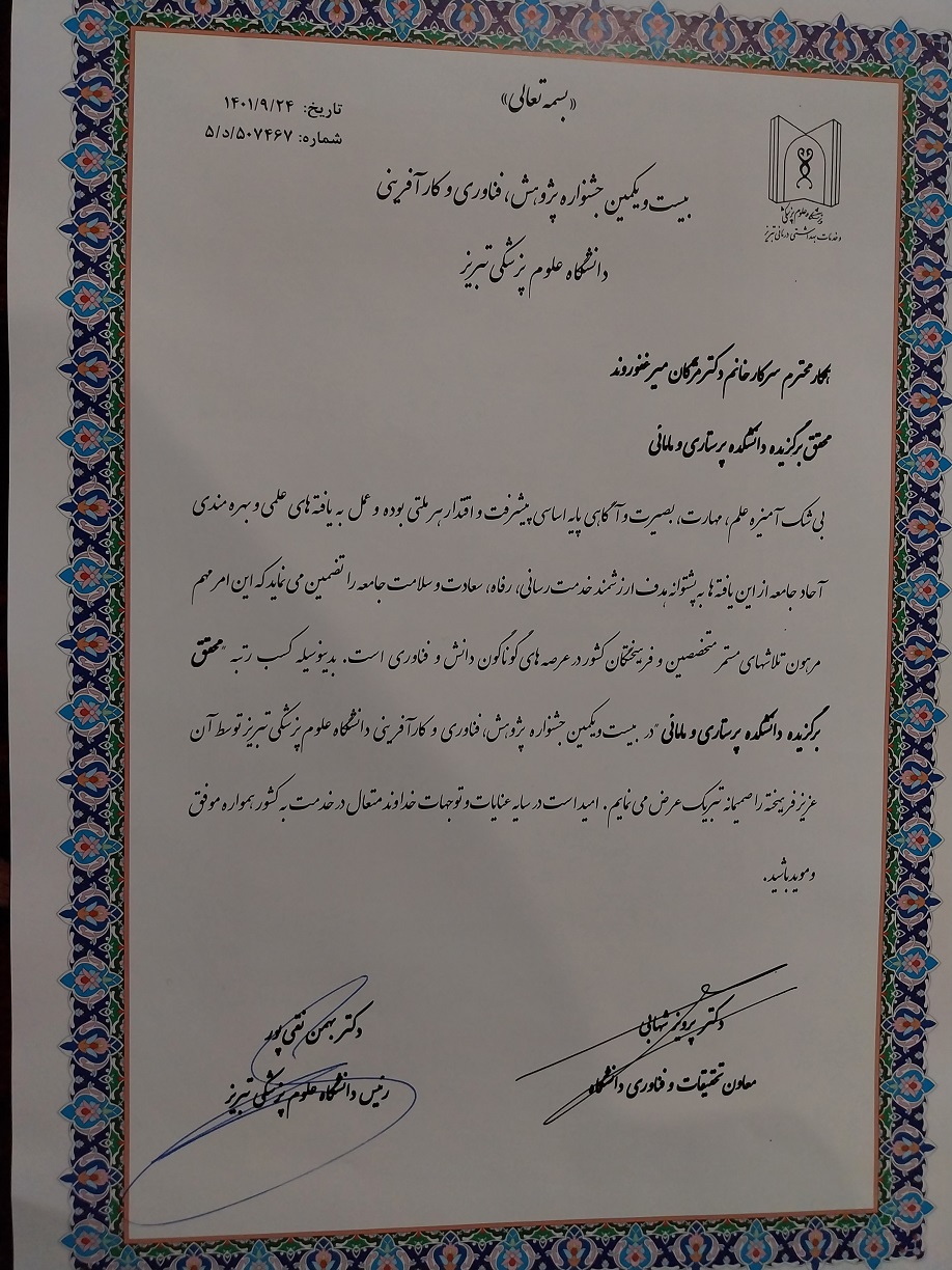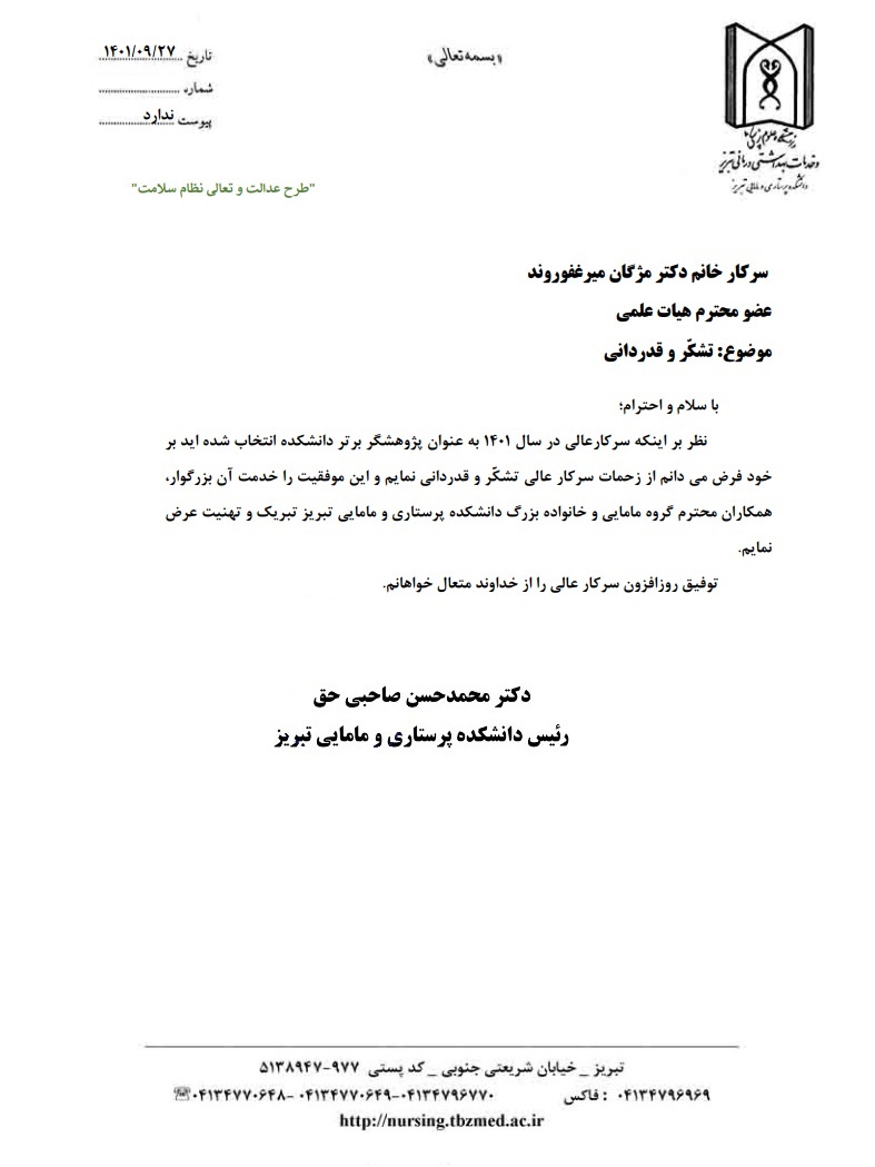 به گزارش روابط عمومی دانشکده در پی انتخاب سرکار خانم دکتر مژگان میرغفوروند (عضو هیات علمی و استاد گروه مامایی دانشکده) بعنوان پژوهشگر برگزیده دانشکده در بیست و یکمین جشنواره پژوهش، فناوری و کارآفرینی دانشگاه علوم پزشکی تبریز در سال 1401، ریاست دانشکده با انتشار پیامی این انتخاب را به ایشان تبریک گفتند.