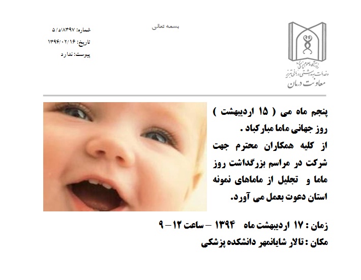 به اطلاع می رساند مراسم بزرگداشت روز ماما و تجلیل از ماماهای نمونه، روز پنج شنبه مورخه هفدهم اردیبهشت 94 در تالار شایانمهر دانشکده پزشکی برگزار خواهد گردید.