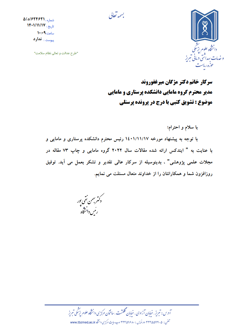 بر اساس پیشنهاد رئیس دانشکده و با عنایت به بررسی ایندکس مقالات سال 2022 گروه مامائی دانشکده، ریاست دانشگاه با ارسال نامه ای از فعالیتهای علمی-پژوهشی خانم دکتر مژگان میرغفوروند تقدیر و تشکر نمودند.