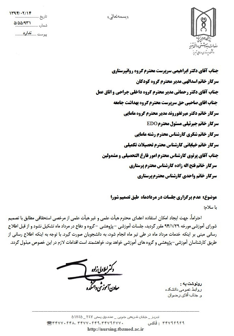 اطلاعیه معاونت آموزشی دانشکده در خصوص عدم برگزاری جلسات در مردادماه امسال بر اساس مصوبه شورای آموزشی دانشکده