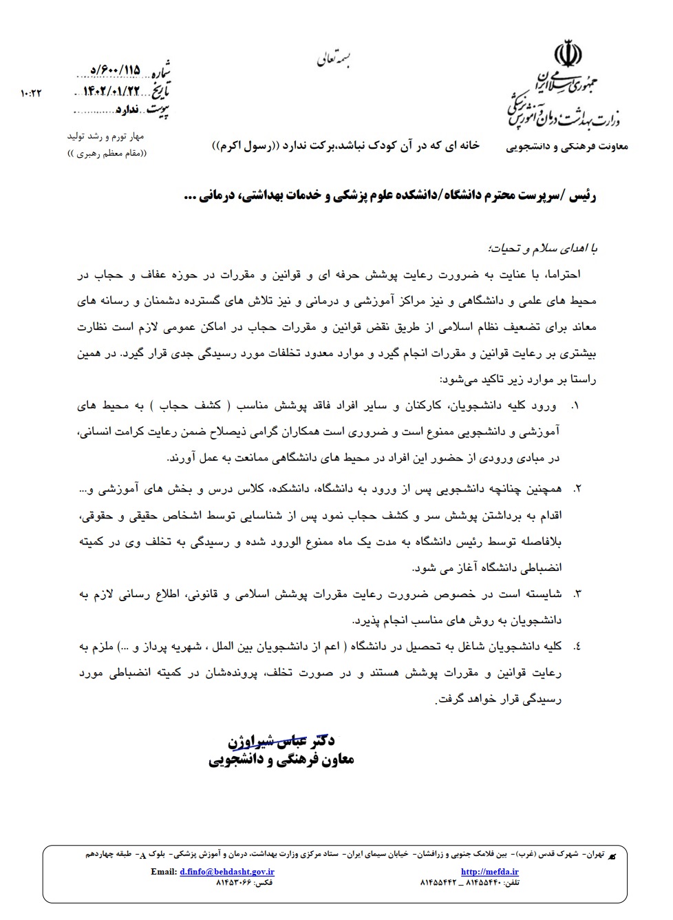 اطلاعیه رعایت پوشش حرفه ای و قوانین و مقررات در حوزه عفاف و حجاب در محیط های علمی و دانشگاهی