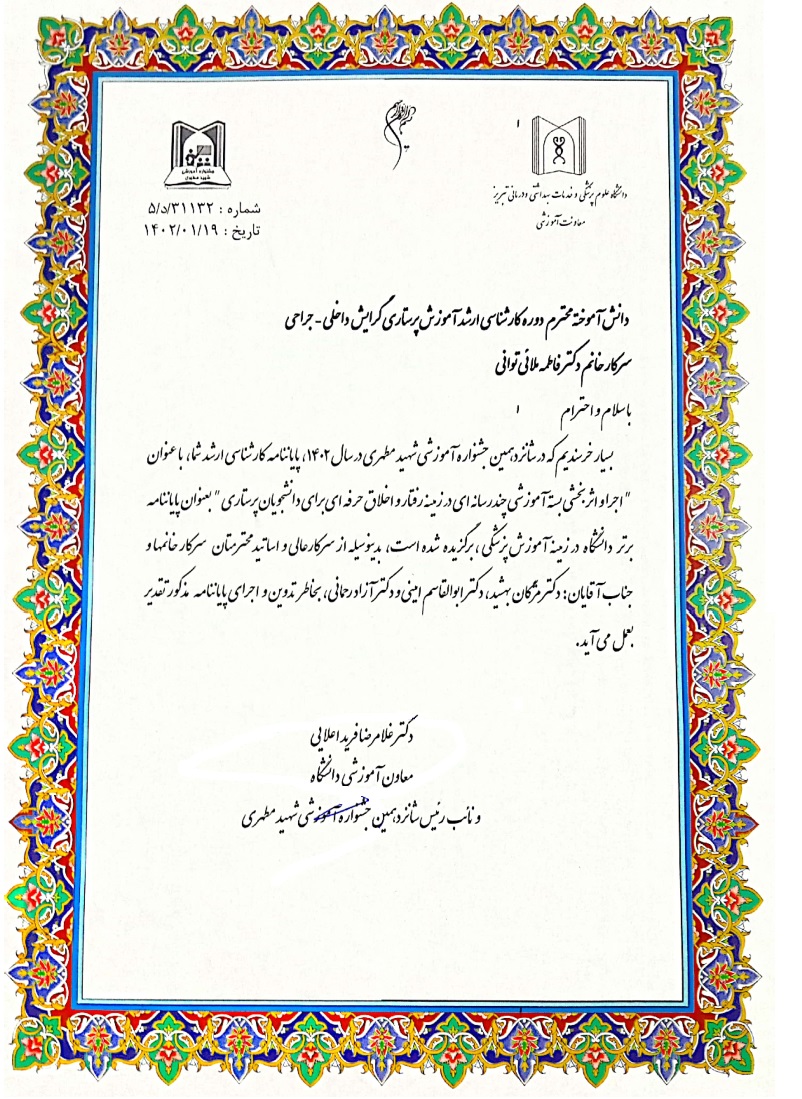 کسب عنوان پایاننامه برتر توسط سرکار خانم فاطمه ملائی توانی در شانزدهمین جشنواره آموزشی شهید مطهری