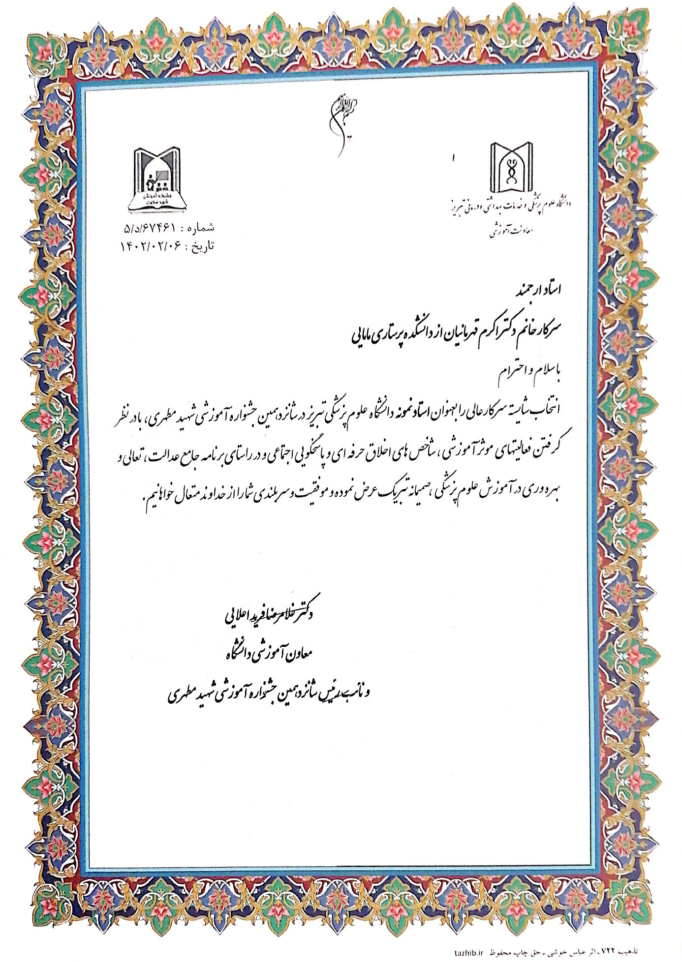 به گزارش روابط عمومی دانشکده سرکار خانم دکتر اکرم قهرمانیان در شانزدهمین جشنواره آموزشی شهید مطهری، بعنوان «استاد نمونه دانشگاه»برگزیده شده است. همچنین فرآیند آموزشی ایشان تحت عنوان «ترجمه و بکارگیری مجموعه کتاب اصول و مبانی پرستاری پاتر و پری برای ارتقای آموزش نظری و عملی دانشجویان پرستاری» در حیطه «طراحی و تولید محصولات آموزشی» بعنوان «فرآیند برتر آموزشی دانشگاه» برگزیده شده است.