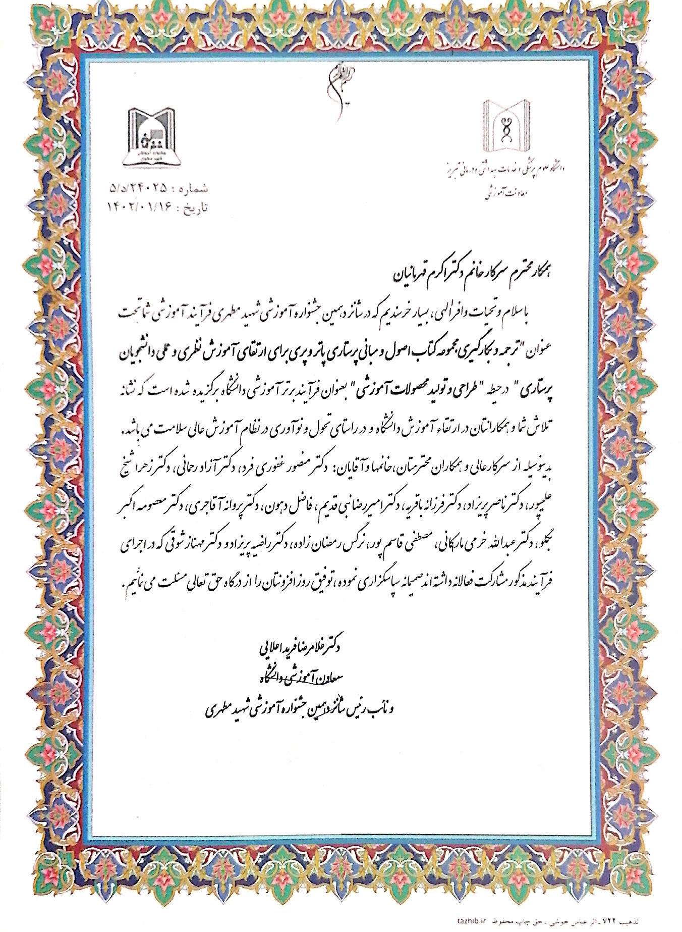کسب عنوان استاد نمونه و فرآیند برتر توسط خانم دکتر قهرمانیان در شانزدهمین جشنواره آموزشی شهید مطهری
