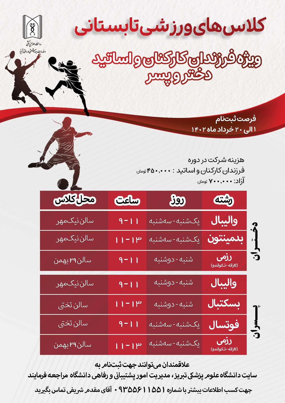 کلاسهای آموزشی ورزشی ویژه فرزندان کارکنان و اساتید دانشگاه برای تابستان 1402 (دختر و پسر)
