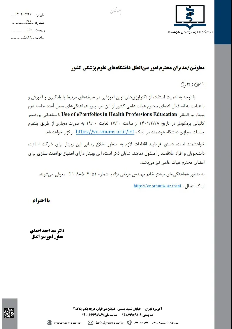 برگزاری وبینار بین المللی Use of ePortfolios in Health Professions Education