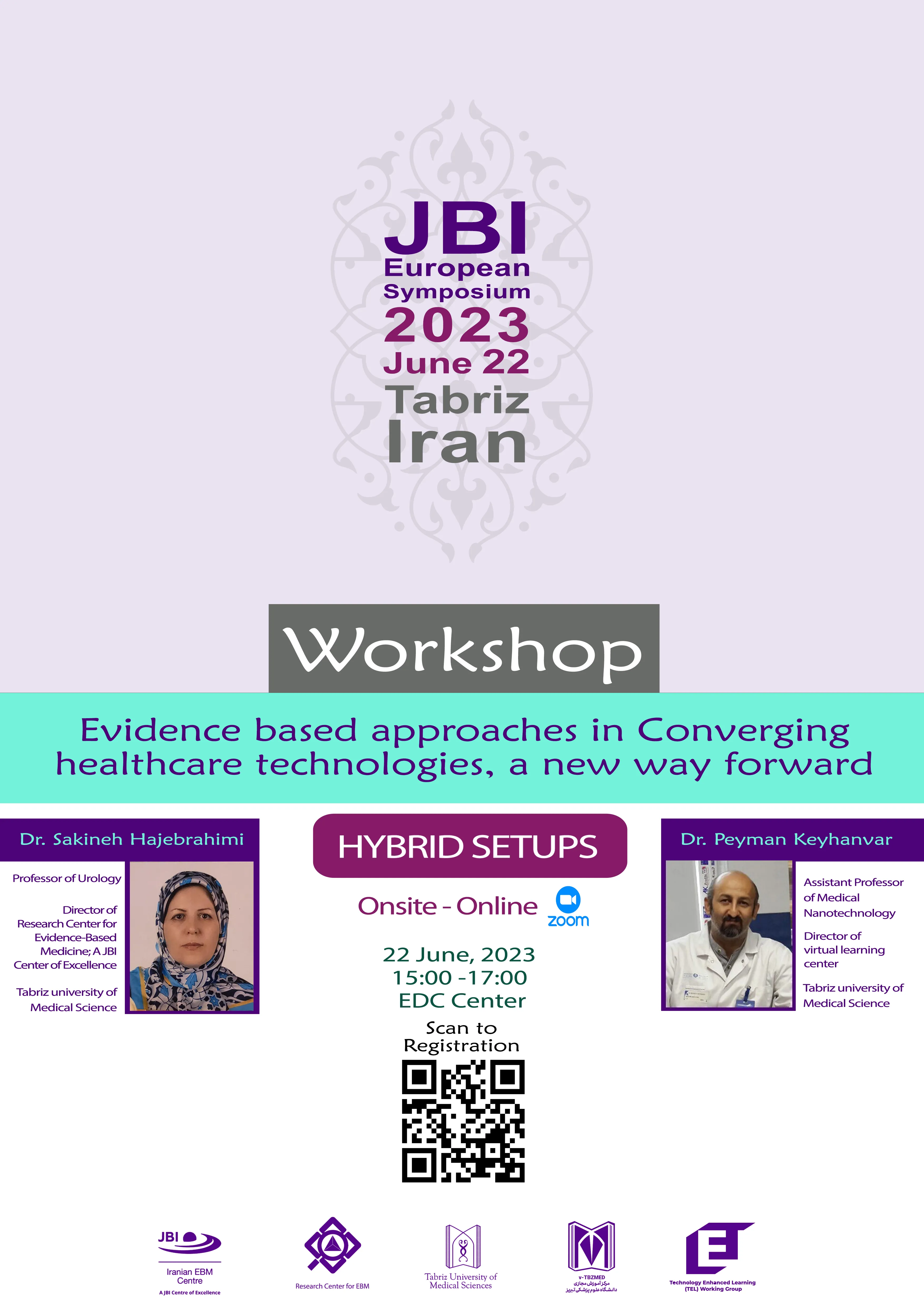 به اطلاع علاقمندان می رساند همراستا با سمپوزیوم سالانه JBI اروپا که روز پنجشنبه یکم تیرماه 1402 در سالن همایش مرکز مطالعات و توسعه آموزش پزشکی برگزار خواهد گردید، کارگاهی تحت عنوان: Evidence based approaches in Converging healthcare technologies, a new way forward نیز از ساعت 15 تا 17 در محل سمپوزیوم برگزار خواهد گردید.
