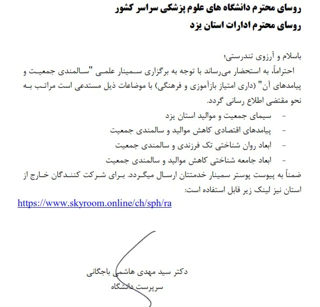 به اطلاع علاقمندان میرساند سمینار علمی «سالمندی جمعیت و پیامدهای آن» به همت دانشگاه علوم پزشکی یزد، روز چهارشنبه مورخ 31 خرداد 1402 از ساعت 8 الی 11:30 برگزار خواهد گردید.