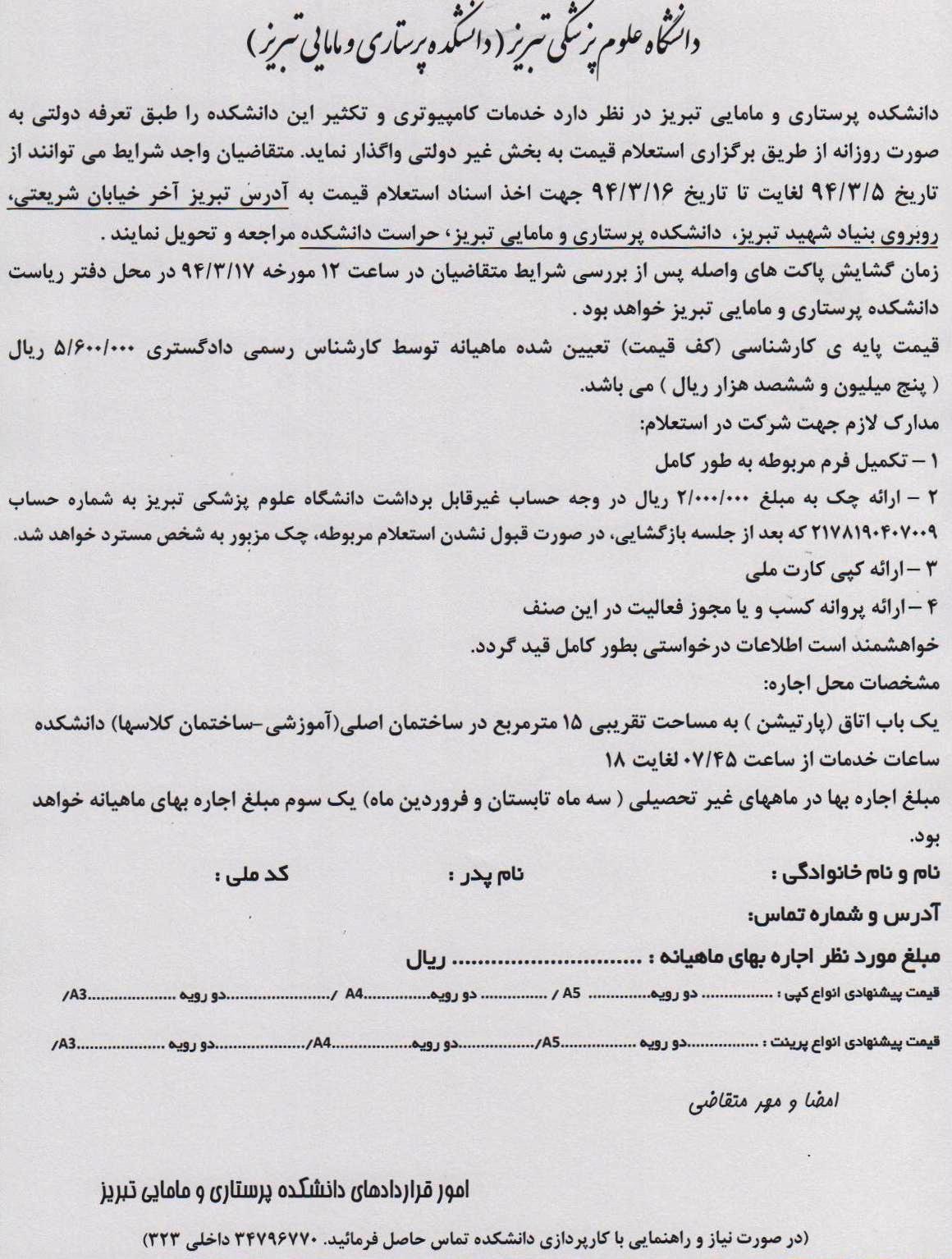 به اطلاع می رساند دانشکده پرستاری و مامایی تبریز در نظر دارد خدمات کامپیوتری و تکثیر این دانشکده را طبق تعرفه دولتی بصورت روزانه از طریق برگزاری استعلام قیمت به بخش غیر دولتی واگذار نماید.