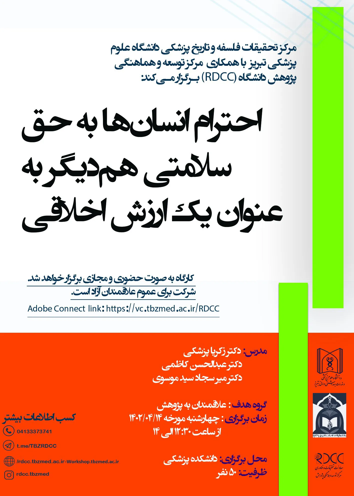 آدرس حضوری: دانشکده پزشکی / لینک شرکت در کارگاه: Adobe Connect: https://vc.tbzmed.ac.ir/RDCC