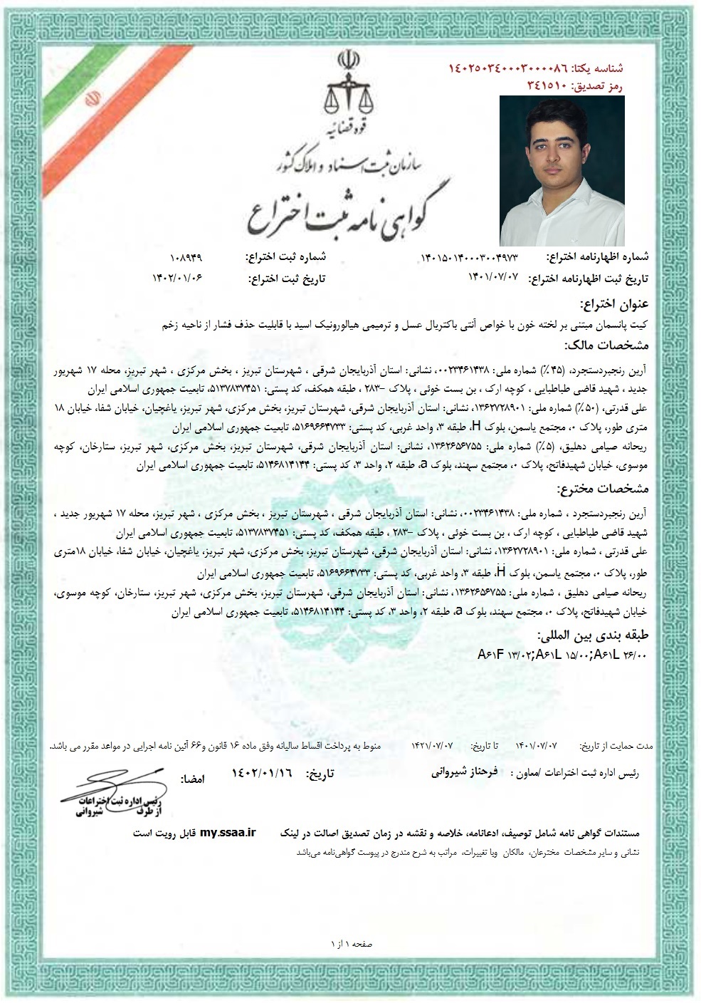 ثبت اختراع «کیت پانسمان مبتنی بر لخته خون با خواص آنتی باکتریال عسل و ...» توسط دانشجوی نخبه دانشکده