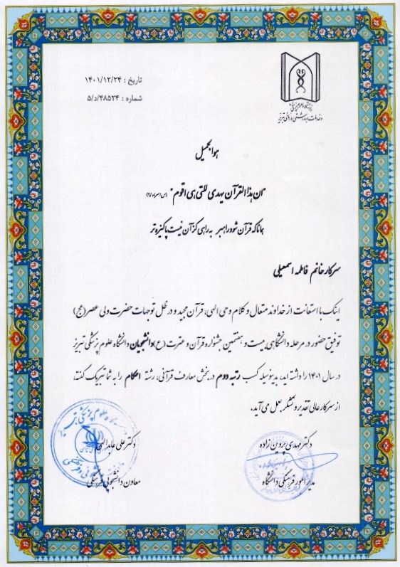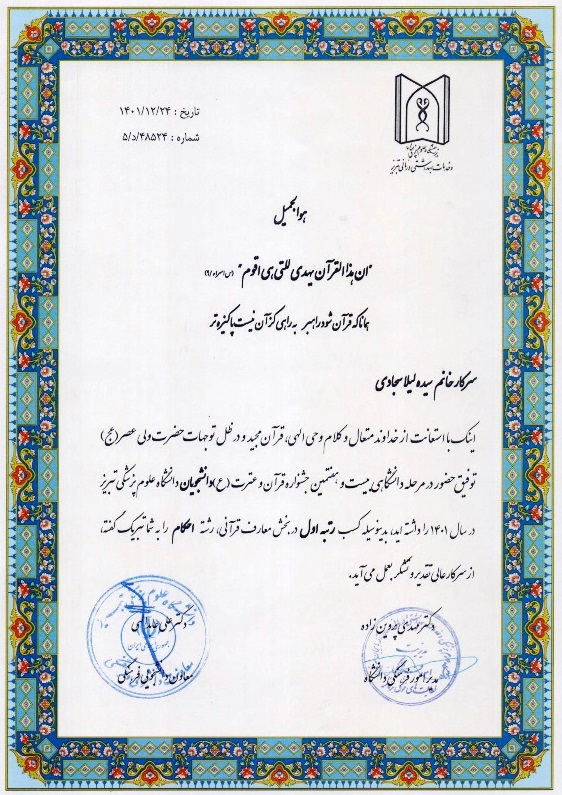 بدین وسیله موفقیت دانشجویان دانشکده، سرکار خانم ها سیده لیلا سجادی و فاطمه اسمعیلی در بخش معارف قرآنی (رشته احکام) در مرحله دانشگاهی بیست و هفتمین جشنواره قرآن و عترت (ع) دانشجویان دانشگاه علوم پزشکی تبریز را تبریک و تهنیت عرض نموده، توفیق روزافزونشان را از درگاه خداوند منان خواستاریم.