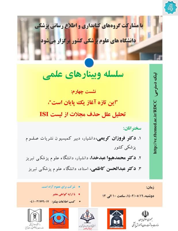 به اطلاع علاقمندان میرساند وبینار علمی «تحلیل علل حذف مجلات از لیست ISI» با مشارکت گروه های کتابداری و اطلاع رسانی پزشکی دانشگاه های علوم پزشکی کشور، روز دوشنبه مورخ 16 مرداد 1402 از ساعت 10 الی 12 برگزار میگردد.