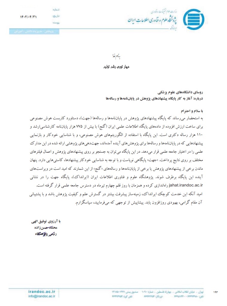 بنابر اعلام رئیس پژوهشگاه علوم و فناوری اطلاعات ایران، پایگاه پیشنهادهای پژوهش در پایان نامه ها و رساله ها، که دستاورد کاربست هوش مصنوعی برای ساخت ارزش افزوده از داده های پایگاه اطلاعات علمی ایران (گنج) می باشد، با بیش از 775 هزار پایاننامه کارشناسی ارشد و 110 هزار رساله دکترا آغاز بکار کرده است.
